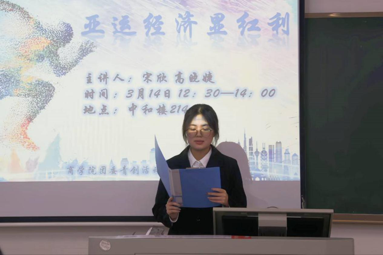 (通讯员 陈思羽 唐思佳 邹子怡)3月14日下午,商学院团委青创活动部于中和楼214举办以“亚运经济显红利”为主题的精勤讲堂活动。此次活动由青年创新创业指导中心活动部周文担任主持人,2021级会计学专业的宋欣和高晓婕担任主讲人。