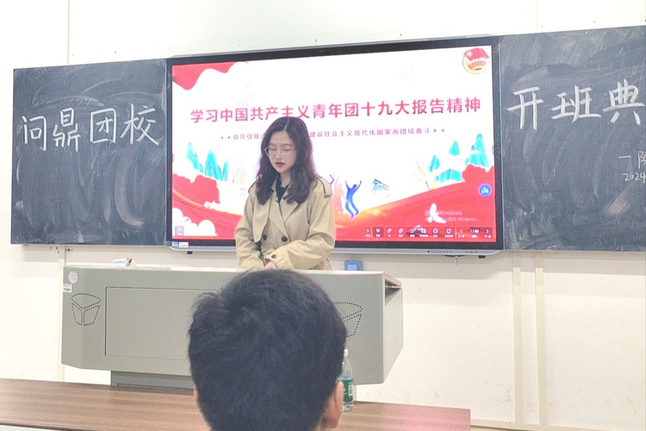 课程在主持人王靖雯致开场词后正式开始。全体成员起立,共同歌唱中国共青团团歌。青年发展工作部负责人张钰佳为各学员介绍团校课程安排、基本规章制度及结业要求。随后,团校学员代表周健玮发言,他承诺,在接下来的团校学习中将坚定理想信念 、刻苦学习、以身作则,为学院发展做出贡献。张婧代表学院团委对参加团校培训的全体学员表示热烈欢迎,并阐明了开办团校的重要意义。她围绕“在革命性磨砺中前进的中国共青团”、“新时代中国青年的使命担当”、“用习近平新时代中国特色社会主义思想统领共青团工作”等方面带领学员们学习共青团十九大精神,教育引导广大团员青年传承红色基因,勇担职责使命。