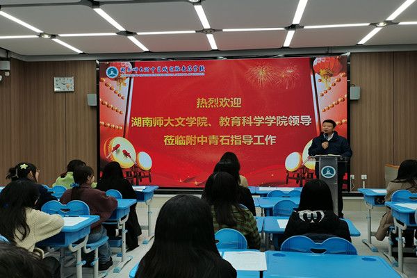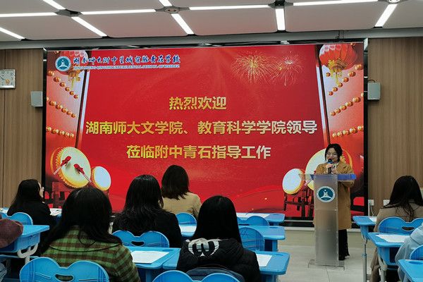 图为文学院副院长吕双伟对师大附中星城实验青石学校的支持和保障工作表示感谢