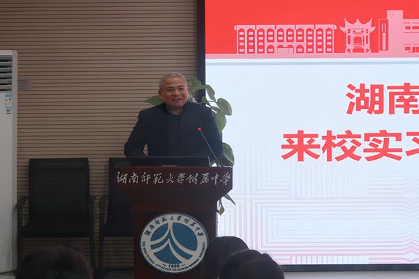 图为顺德区实验中学党委书记周晖致欢迎辞,向实习生们介绍校园文化