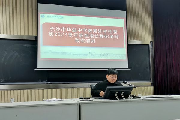图为长沙市华益中学教务处主任兼初2023级年级组组长程砣致辞
