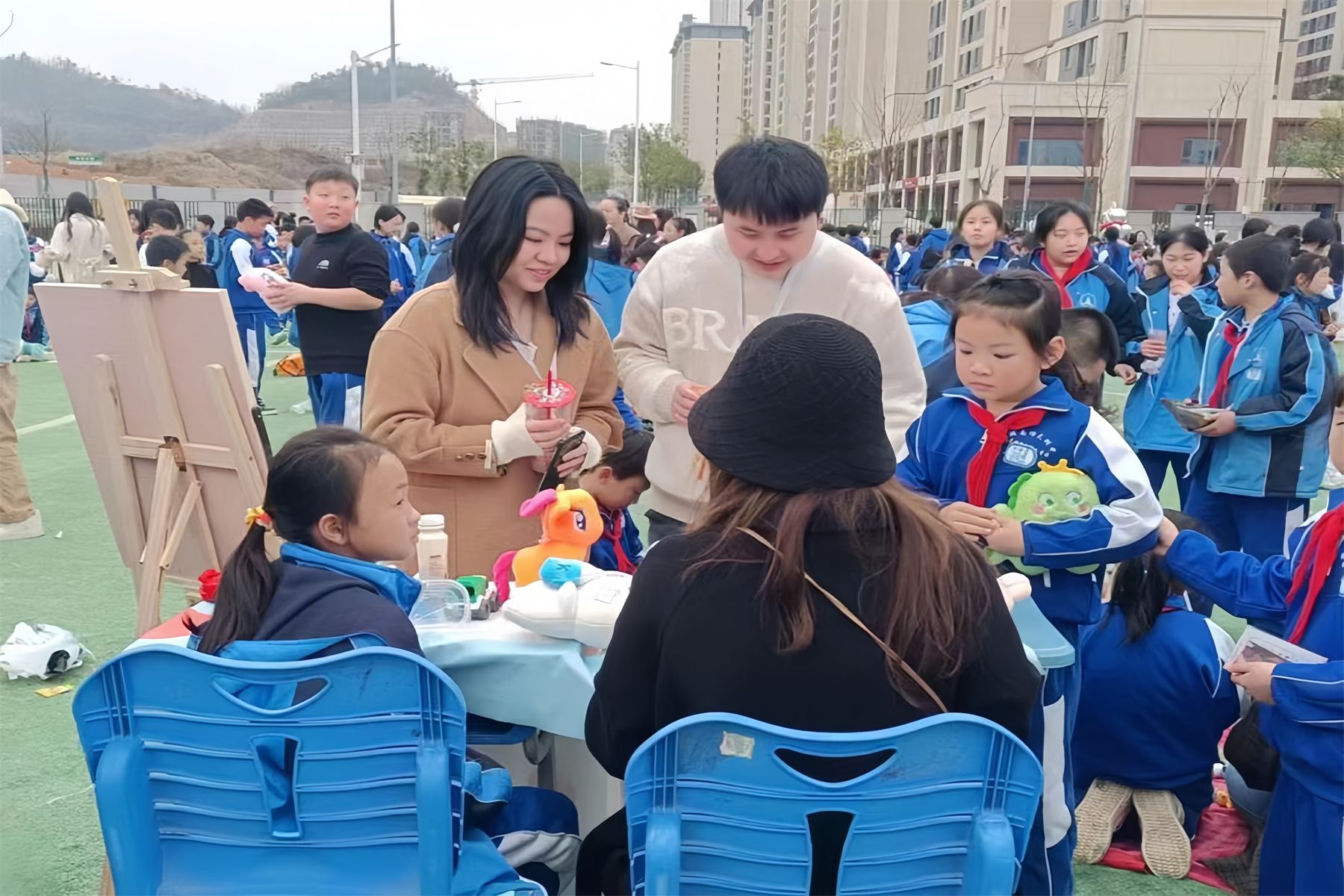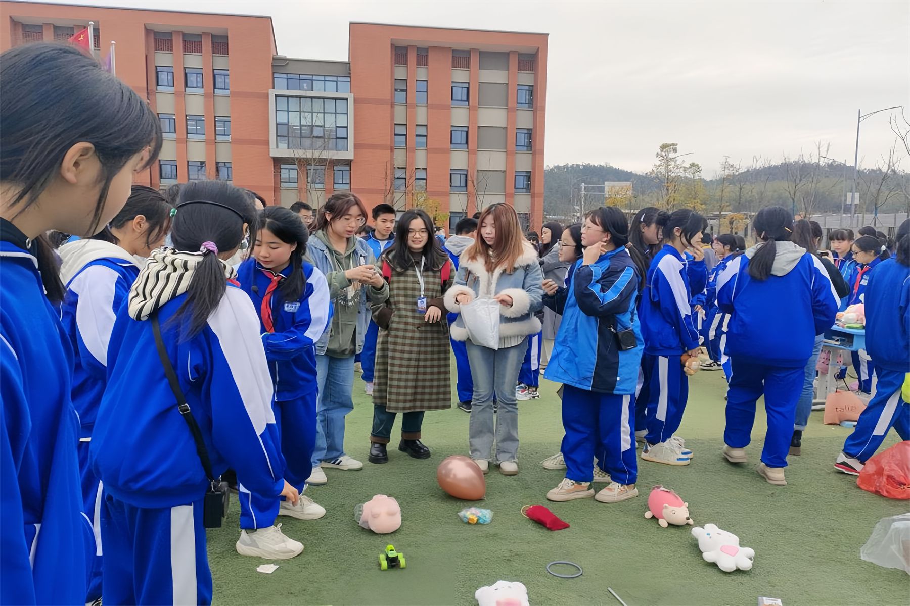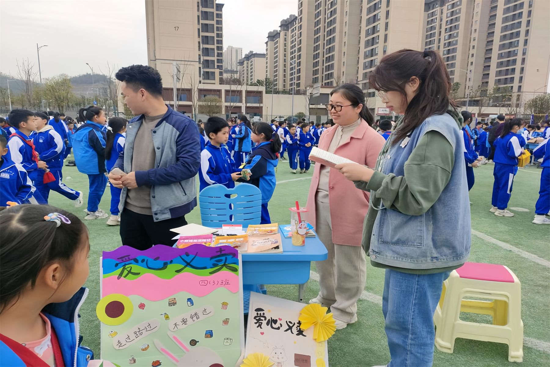 此次义卖活动秉持着“义卖有价,爱心无价”的理念,实习队员协助班主任带领各班学生在学校田径场布置摊位,义卖物品种类多样:学生亲手制作的小蛋糕、凉皮凉面、闲置衣物、二手书籍、手工制品、玩具等,其中美食摊位最受师生欢迎。此外,各班积极创新义卖形式,在宣传常规摊位的同时,组织抽奖、套圈等小游戏。