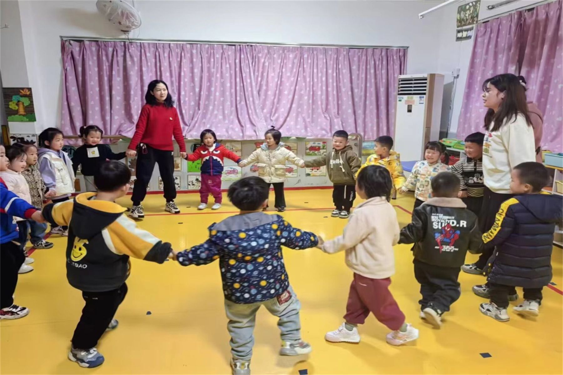 课程结束后,老师与志愿者们共同组织了“拉手手”游戏,孩子们手牵手围成一圈,按照指令快速抱团,现场气氛热烈。