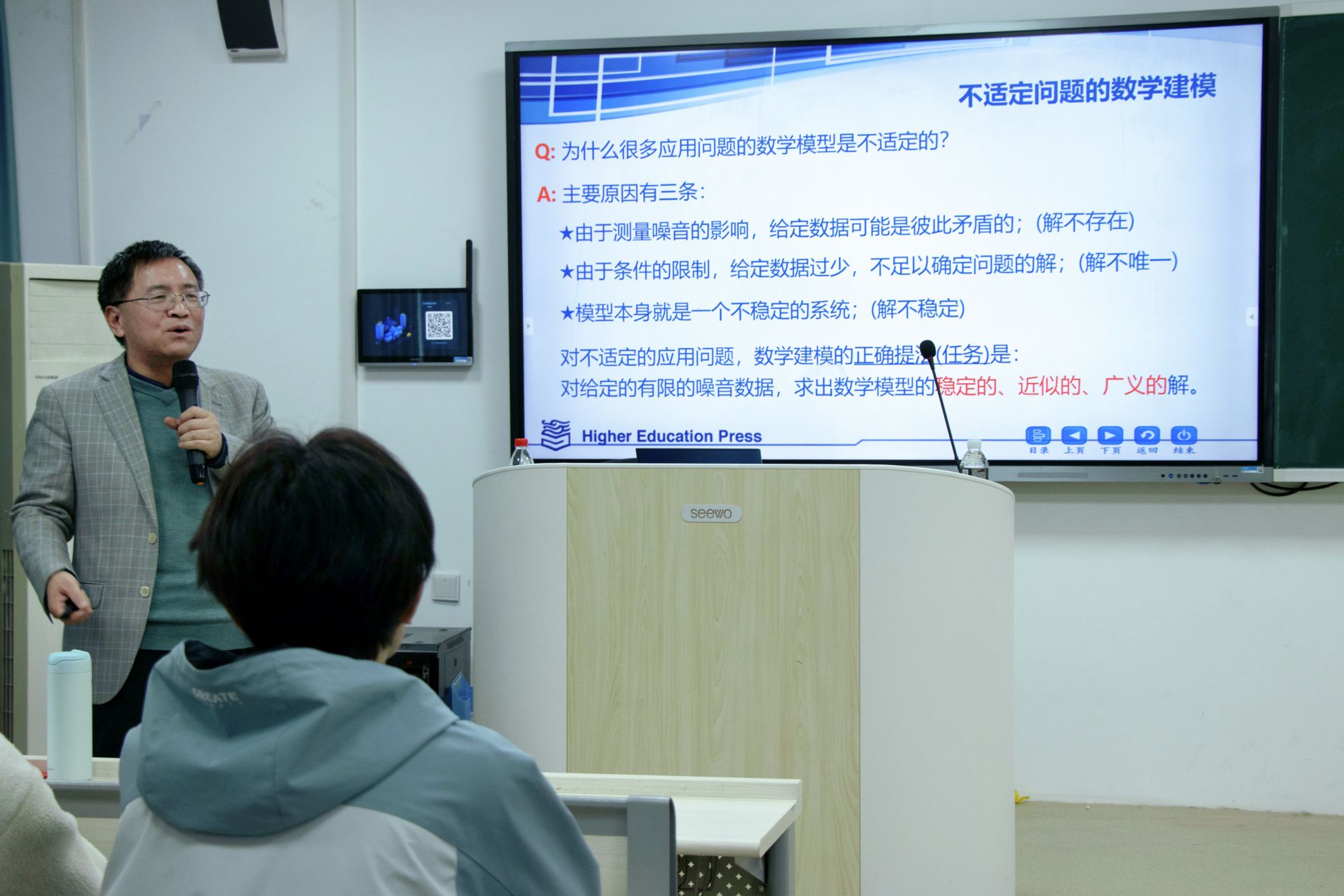讲座内容分为“从盲人听鼓谈起”、“不适定性问题的数学建模”、“海底寻宝和地质勘探”三个部分,刘继军通过音频与视频介绍盲人听鼓的事例,由此引入反问题的概念。随后,他向同学们科普了反问题的工程模型背景,强调了反问题的不适定性,从三个方面教学求解方法,并举例具体情境进行详细讲解。围绕不适定性问题,刘继军讲解了数学模型不适定的原因以及正确提法,表明具体求解步骤依赖于具体问题,不存在万能的求解策略。为了帮助同学们理解透彻,他还以“海底寻宝”和“地质勘探”模型为例,从神话故事引入模型并加以推广,深入剖析其解题思路。