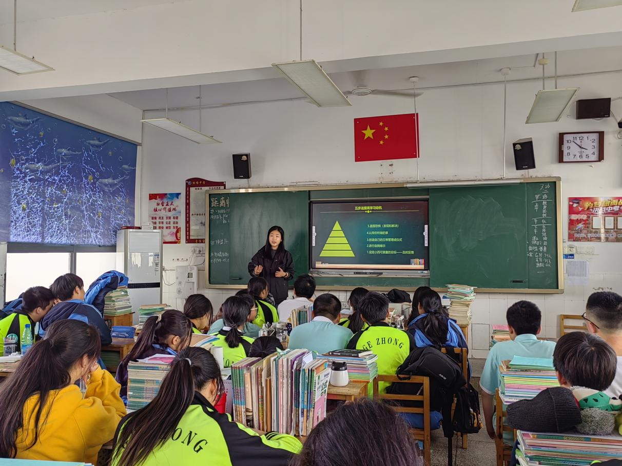图为王梦宾在“你比任何时候都接近梦想”课堂上为初三同学讲解”五步学习法“,并鼓励同学们将它运用到实际学习中。