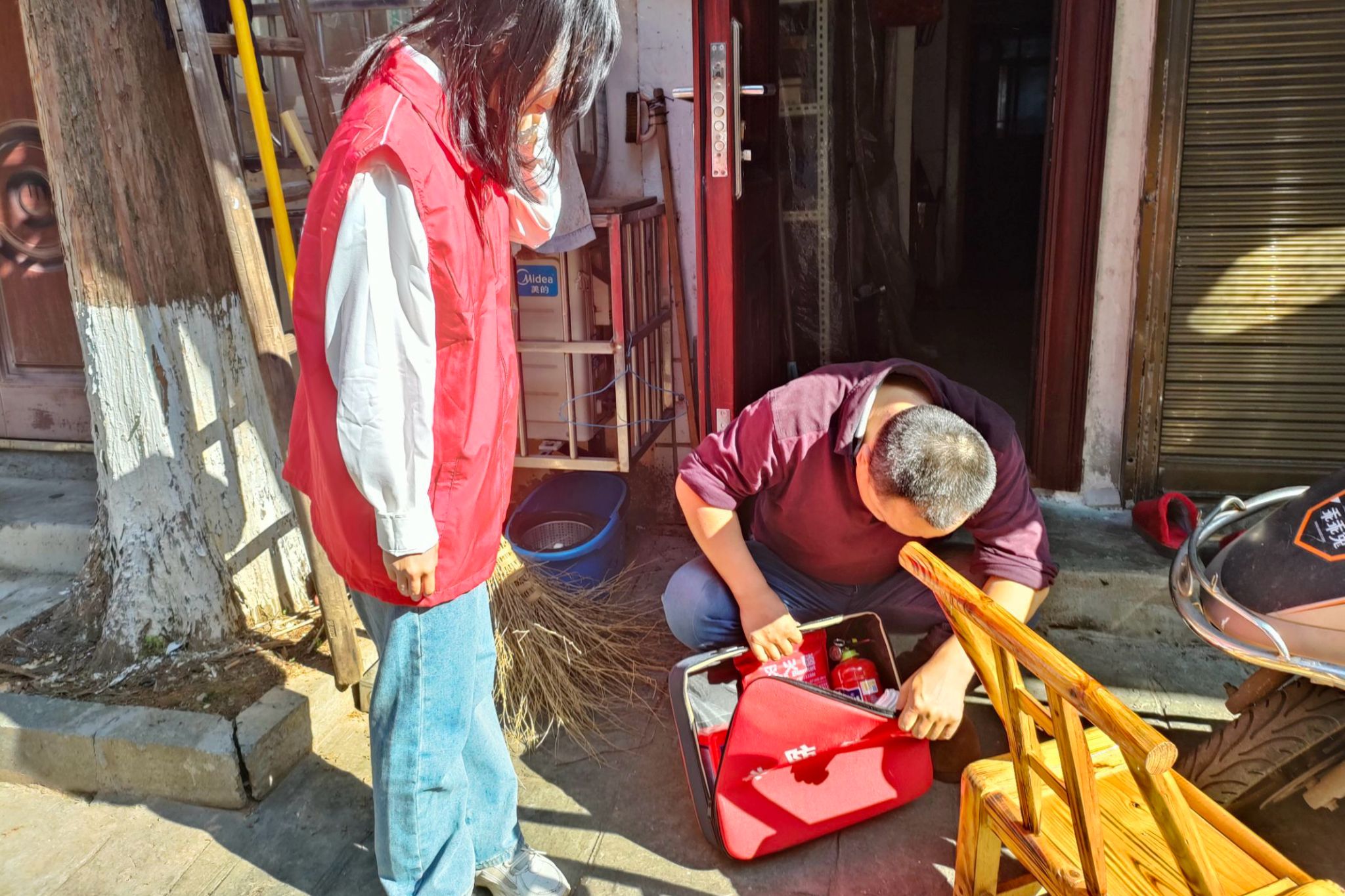 岳龙社区志愿者在进行消防物资发放