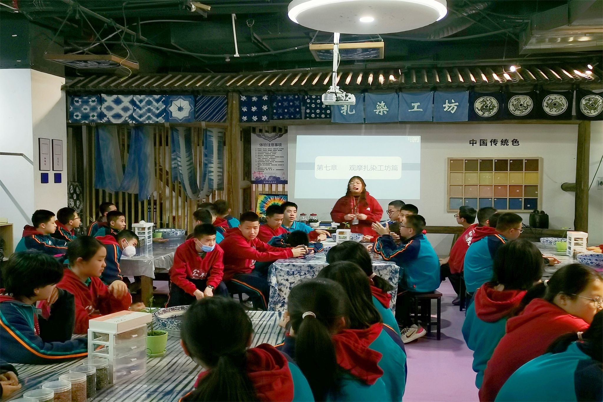 参观过后,全体学生走进染织工坊,学习体验扎染工艺。工作人员耐心地向学生们介绍了扎染的历史渊源、染色所用的植物原料以及扎染的基本手法。学生们初步了解和掌握这些知识后,开始动手制作自己的扎染作品。他们运用捆扎、夹扎等不同手法,将自己的想象力和创造力发挥得淋漓尽致。