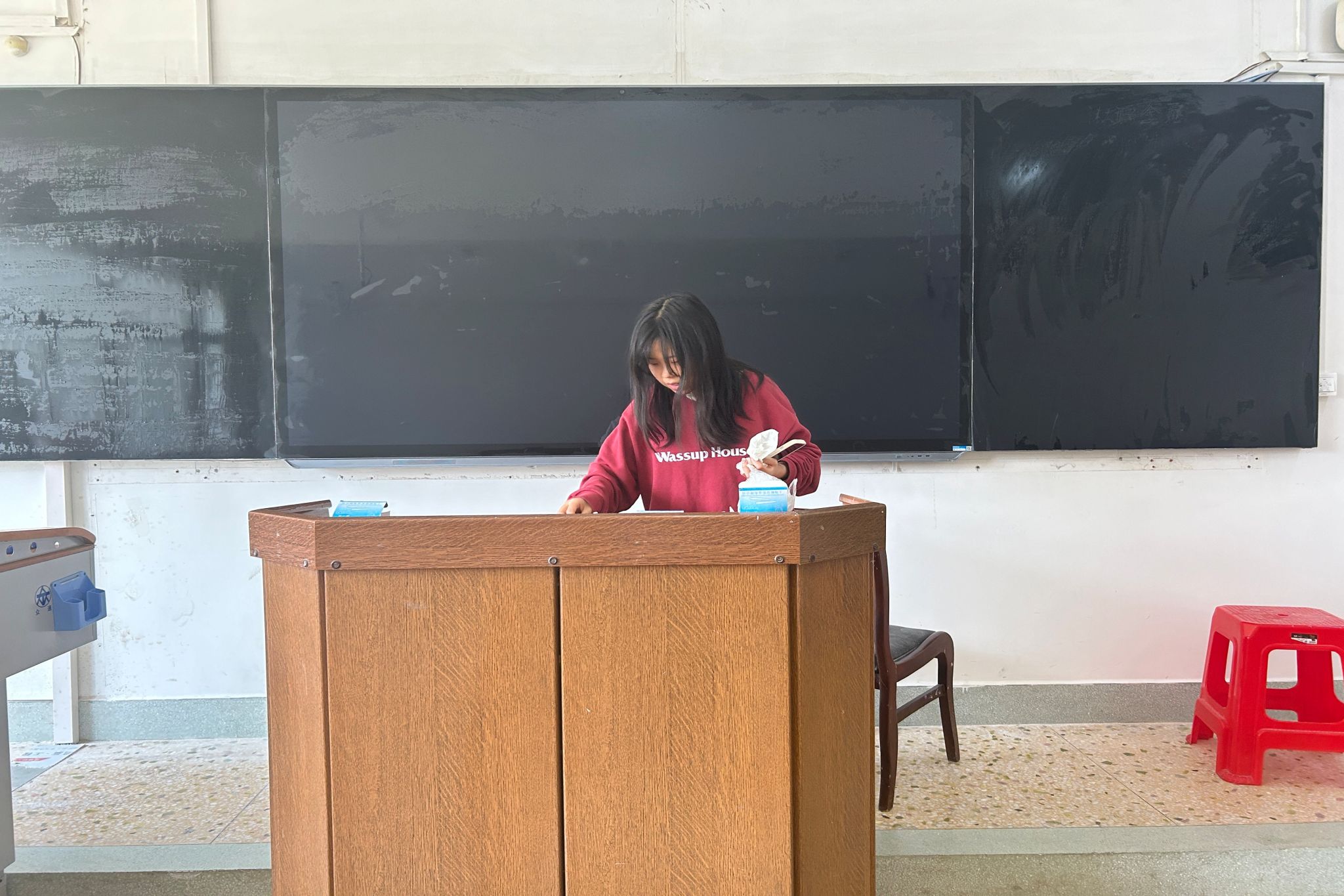 图为志愿者领取打扫任务后,开展教室保洁工作,参与创建美丽校园。