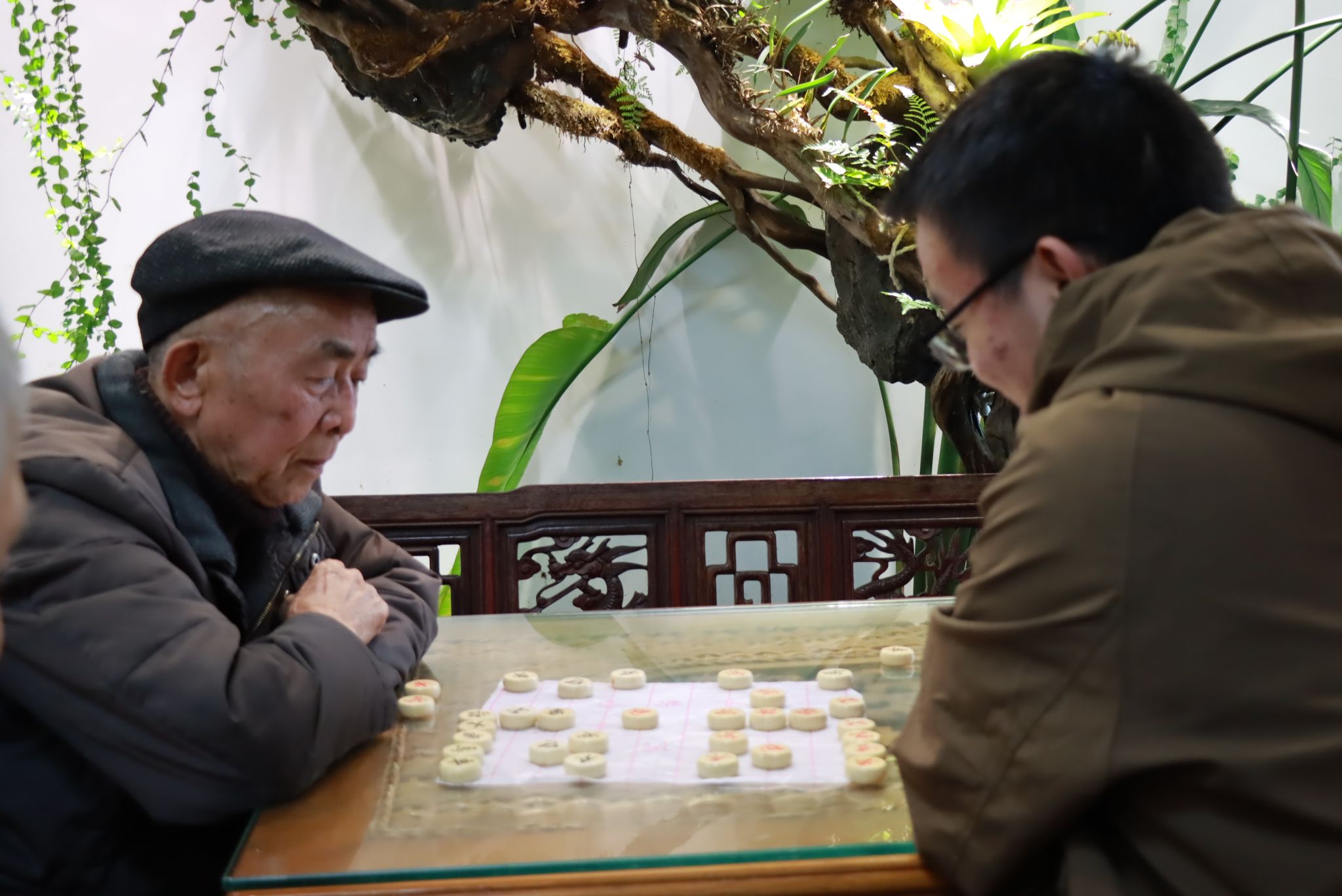 图为志愿者陪同老人进行棋类运动,切磋技艺,陪伴老人。