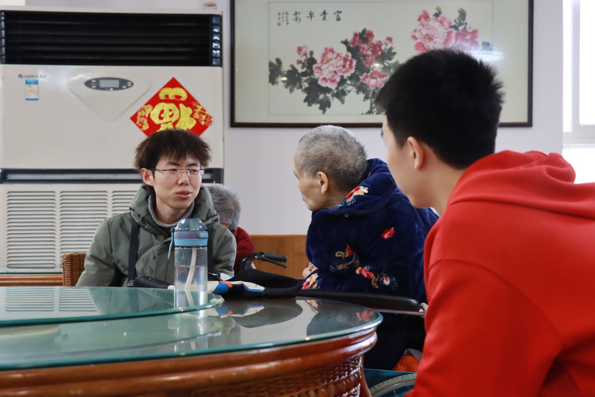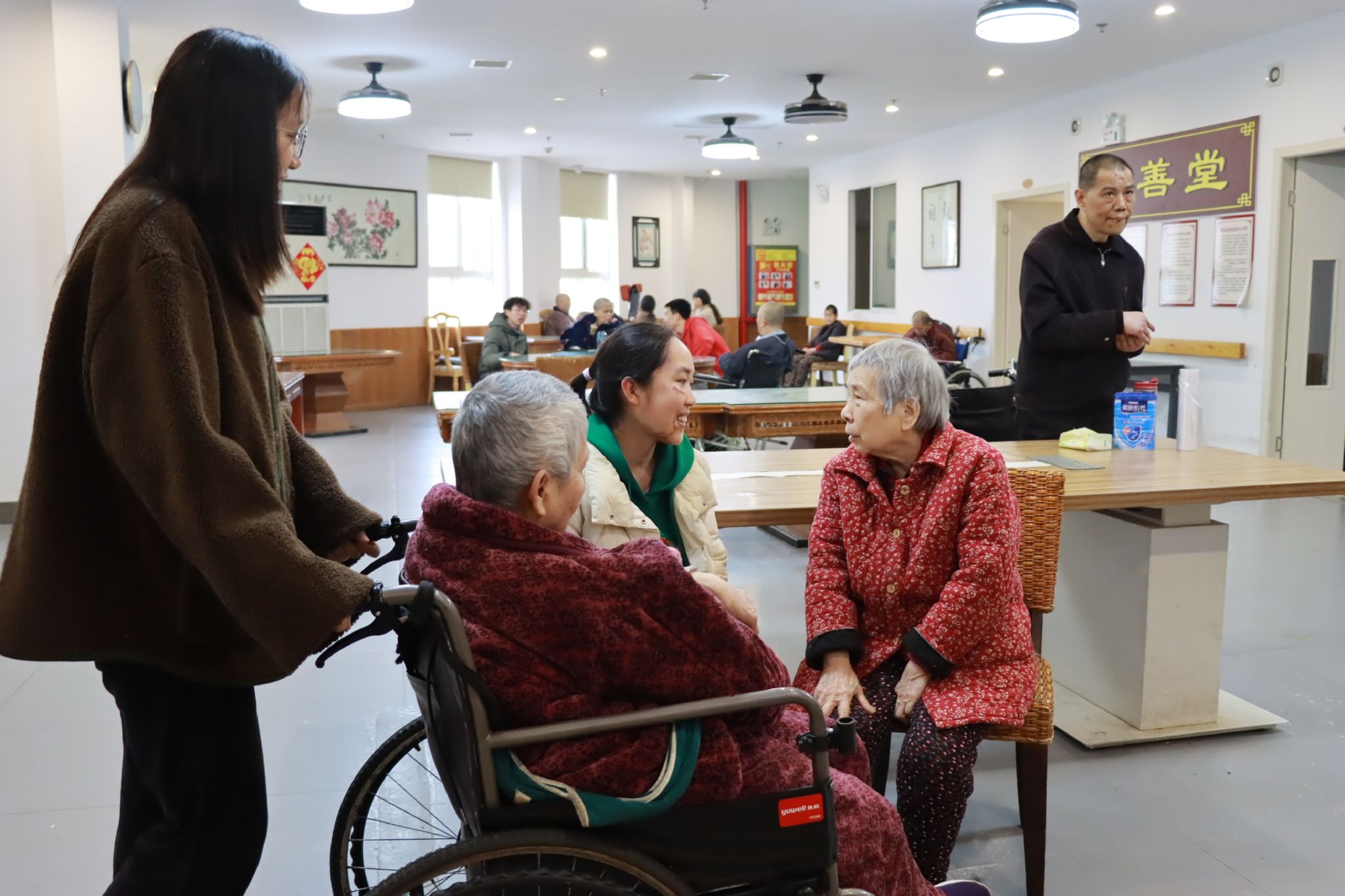 图为志愿者照顾腿脚不便的老年人,与其聊天交谈,