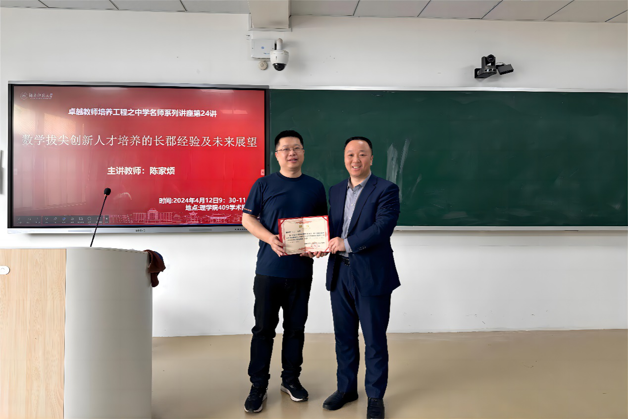 (通讯员 胡曼诗 陈田芳 黄美绮)4月12日上午,数学与统计学院(以下简称“数统院”)于格物楼409学术报告厅开展数统院“卓越教师培养工程”中学名师系列讲座第二十四讲。讲座邀请了长沙市长郡中学数学教研组组长、长郡教育集团数学名师工作室主持人陈家烦担任主讲人,数统院数学系副主任袁智强、2021级辅导员周逸、数学与应用数学专业2021级全体本科生、数学教育方向部分研究生参与此次活动。