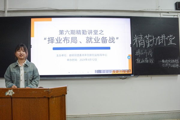 (通讯员 汤誉琳 迟薪格 唐亘嫣)4月12日晚,数学与统计学院(以下简称“数统院”)团委青年创新创业指导中心于格物楼202教室开展“择业布局、就业备战”精勤讲堂,此次活动由2020级数二班李彦琪、大数据班柯紫娟担任主讲人。