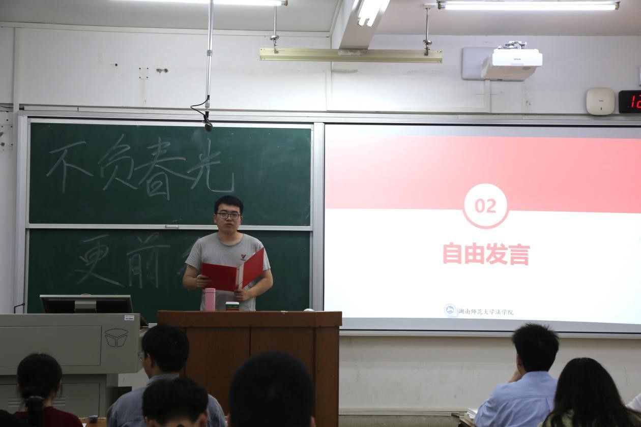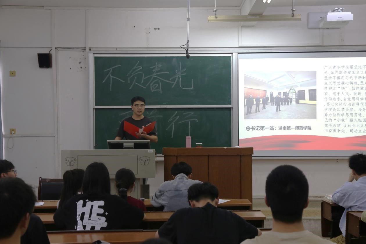 主讲人首先播放了一段视频展示习近平总书记考察湖南之行,并从发展教育事业、提高人民福祉、坚持科技创新等方面对习近平总书记在此次考察期间作出的重要讲话、重要指示进行介绍。主讲人表示,青年学生要敢于适应新环境、迎接新挑战,大胆探索、勇于创新,破解发展难题,勇攀科技高峰,担负起科技强国的时代重任。要在科学理论武装头脑的同时,以实际行动诠释信仰追求。在研讨会的自由发言环节,共七名同学进行发言,他们从科技创新、教育事业发展等多个角度分析习近平总书记湖南行精神的内涵,表达自己的理解并提出相应的倡议。