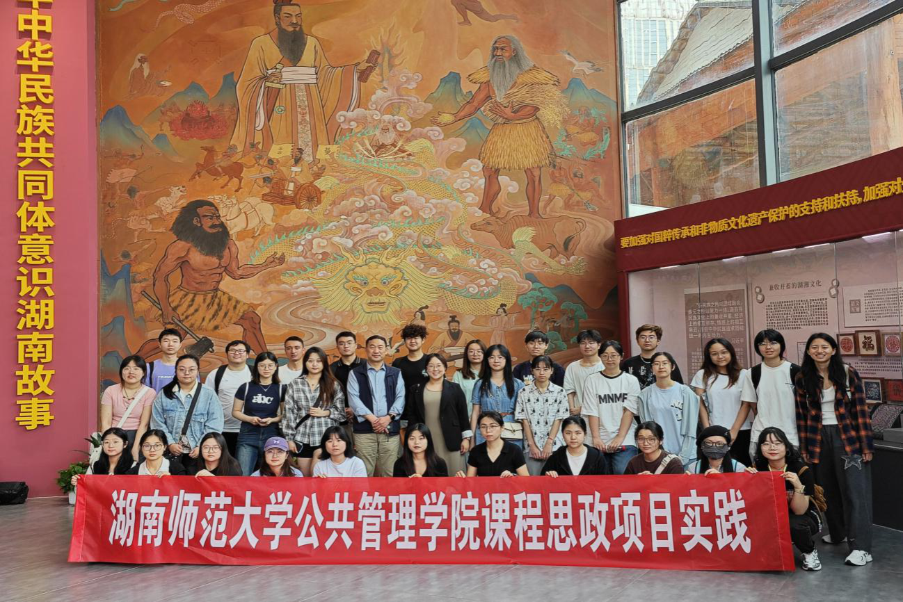 (通讯员 郭振帅 王欣 周涵韵)为开展湖南省普通高校教学改革项目《以“铸牢中华民族共同体意识”为导向的社会学专业课程思政“四慧一体”模式的探索与实践》,深入理解中华民族共同体的内涵,感受中华优秀传统文化与非物质文化遗产的魅力,4月26日上午,公共管理学院(以下简称“公管院”)社会学系2021级本科生及部分研究生在公管院社会学系副教授王欣的带领下,前往湖南省铸牢中华民族共同体意识体验馆(以下简称“体验馆”)开展课程思政实践活动,将《民族社会学》的课堂搬进社会大田野。湖南省民族宗教事务委员会协调推进处一级调研员龙晔生与雨花非遗馆的讲解员王晋喜进行现场授课。