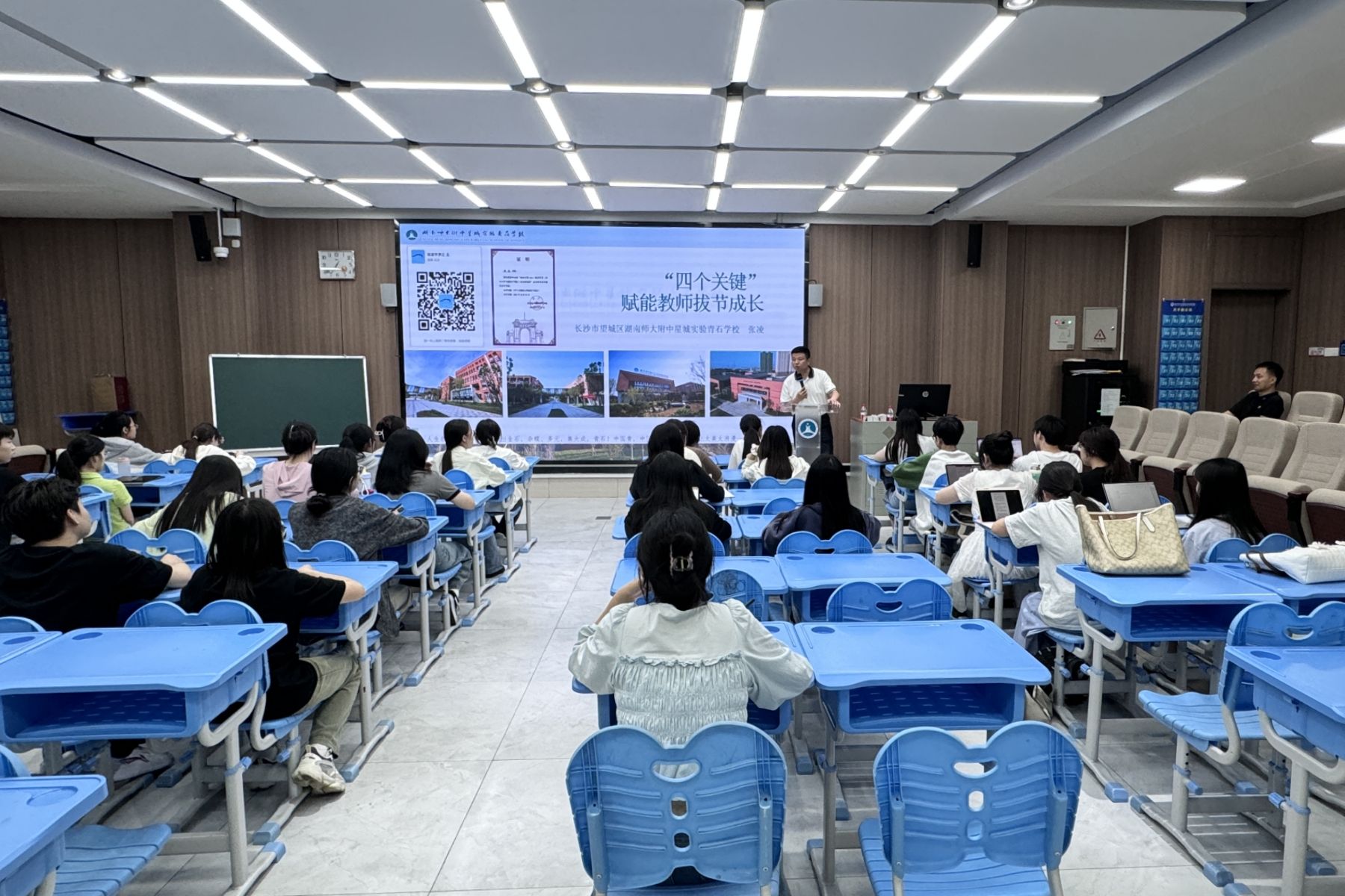 (通讯员 葛敏 彭依雪 郭梦之)5月8日晚,文学院2021级赴师大附中星城实验青石学校实习队在青蓝教研室参加“‘四个关键’赋能教师拔节成长”主题讲座,此次讲座由师大附中星城实验青石学校校长张凌主讲,实习队全体队员参加。