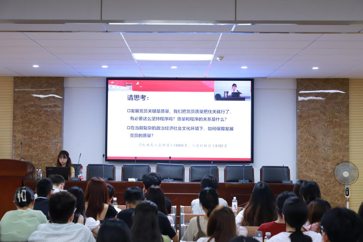 党课培训环节,校党委组织部副部长陈一诚进行专题六“厘清入党条件,强化党员义务权利意识”的授课,他从申请入党的基本条件、党员的基本要求、党员的义务和权利等方面内容为学员们进行讲解。随后,校党委组织科科员文敏进行专题十二“把握入党流程,严格遵守发展党员流程”的授课,仔细讲述了发展党员的程序和手续,如提交入党申请书的具体要求以及入党积极分子的确定和培养教育等,帮助大家理清各阶段的任务及注意事项。