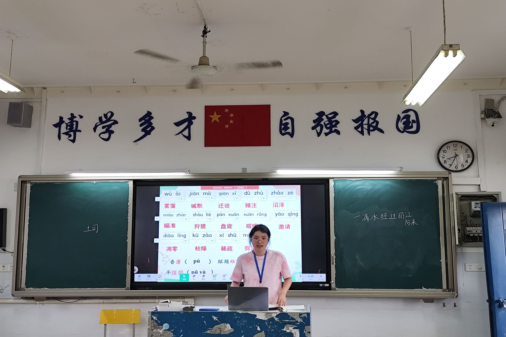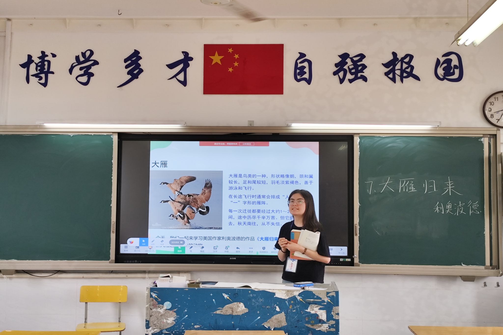 此次活动共有四位实习队员进行队内新授课。图拉妮萨围绕《大雁归来》这篇课文,设计了初读感知、分析形象、感悟情怀三个环节,旨在带领同学们深入了解大雁,并体会作者对大雁的喜爱之情。肖天姿在讲授《大道之行也》时,不仅与《桃花源记》进行了对比阅读,还介绍了近代以来为追求理想社会而前仆后继的先辈事迹,并在课堂结尾对同学们提出了为理想社会而奋斗的期许。潘羊和在引导同学们翻译《逍遥游》后,深入分析了鲲鹏在文中的形象,并在课堂最后对同学们的字词学习效果进行了检测。潘美欣则以《一滴水经过丽江》为教材,创设了“想象自己是一滴水,穿越古今觅芳踪”的情境,让同学们从采风、取景、拍摄三个方面来赏析文中所描述的丽江之美。