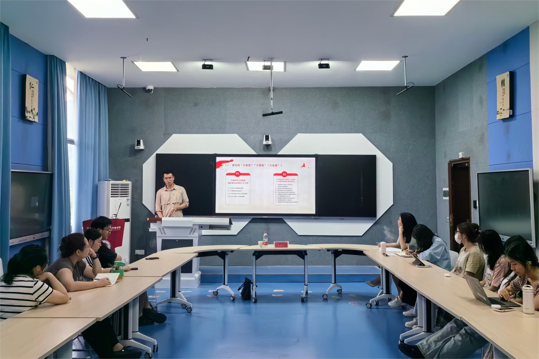 资喻宇以“大思政 大教育 大传播”为切入口,分析了融媒体时代的教育事业与教育宣传,并介绍了湖南教育电视台的教育宣传“主阵地”,强调要落实“立德树人”的根本任务,做到“三全育人”。他还为校园宣传和课程宣传提出了建议和策略,强调要坚持马克思主义新闻观,牢记宣传思想工作的使命任务。