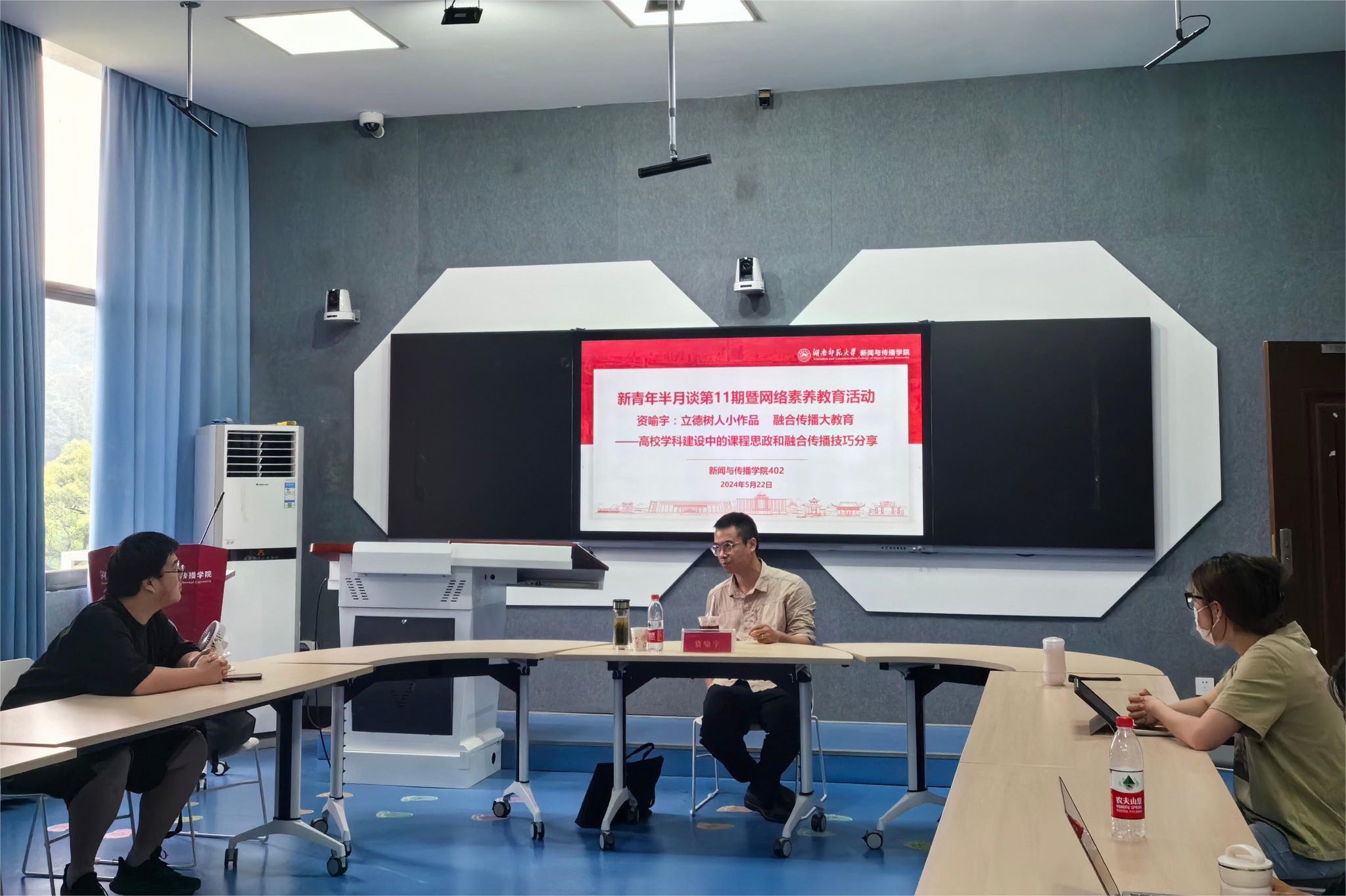 (通讯员 何一苇 李岩)为分享交流课程思政与融合传播技巧经验,提升大学生网络素养,5月22日下午,新青年半月谈第11期暨网络素养教育活动在新闻与传播学院401教室开展。此次活动特邀国家二级导演、湖南教育电视台副总监资喻宇做“立德树人小作品,融合传播大教育——高校学科建设中的课程思政和融合传播技巧分享”主题讲座。新传院党委副书记张小春、2023级辅导员张江汀、2020级辅导员贺静一参加讲座,2022级辅导员王洋主持此次活动。