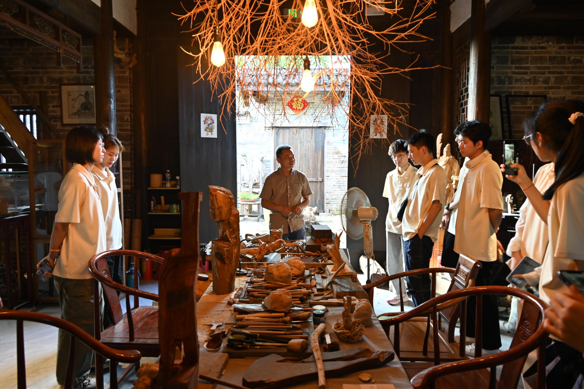7月6日下午,队伍前往赣州市客家文化遗产研究院开展交流,座谈会由客家文化遗产研究院副院长曾小军主持,客家文化遗产研究院副院长付先斌、叶愉、李刚和“赣州行”三下乡实践队全体队员参加会议。会议围绕近年来客家文化与旅游业的结合推广展开,以七鲤古镇、客家遗产活态馆为例,详细介绍了客家文化遗产研究院在政策落实、专业研究、非遗传承三方面实现的丰硕成果。座谈会结束后,省级非遗传人付先斌带领队员们参观了“木听风吟”非遗根雕工作室,他指出,客家根雕在现代科技的迅速发展中如何保存和传承需要进一步深入探索。