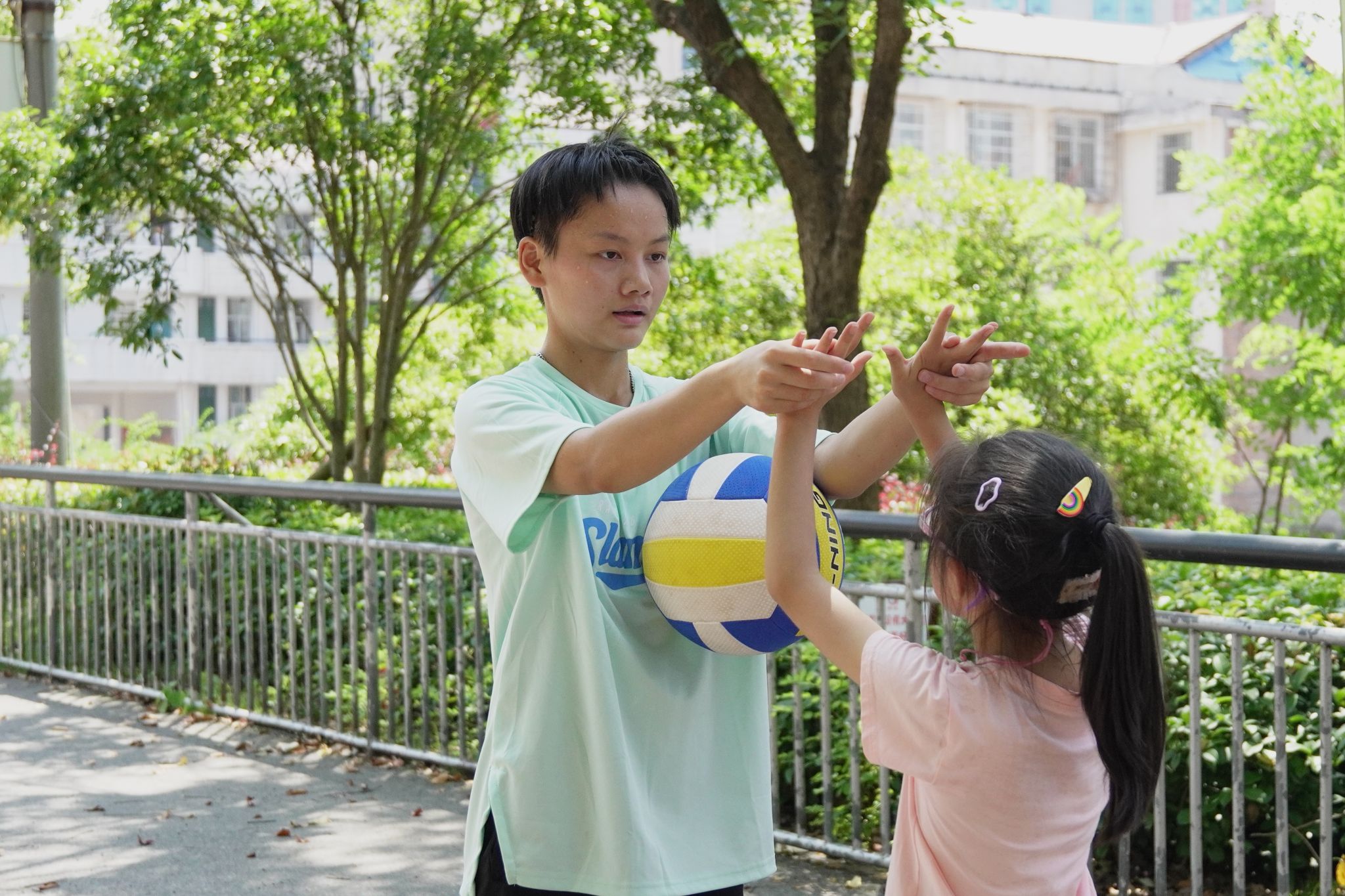 队员一对一指导学生排球发球技巧