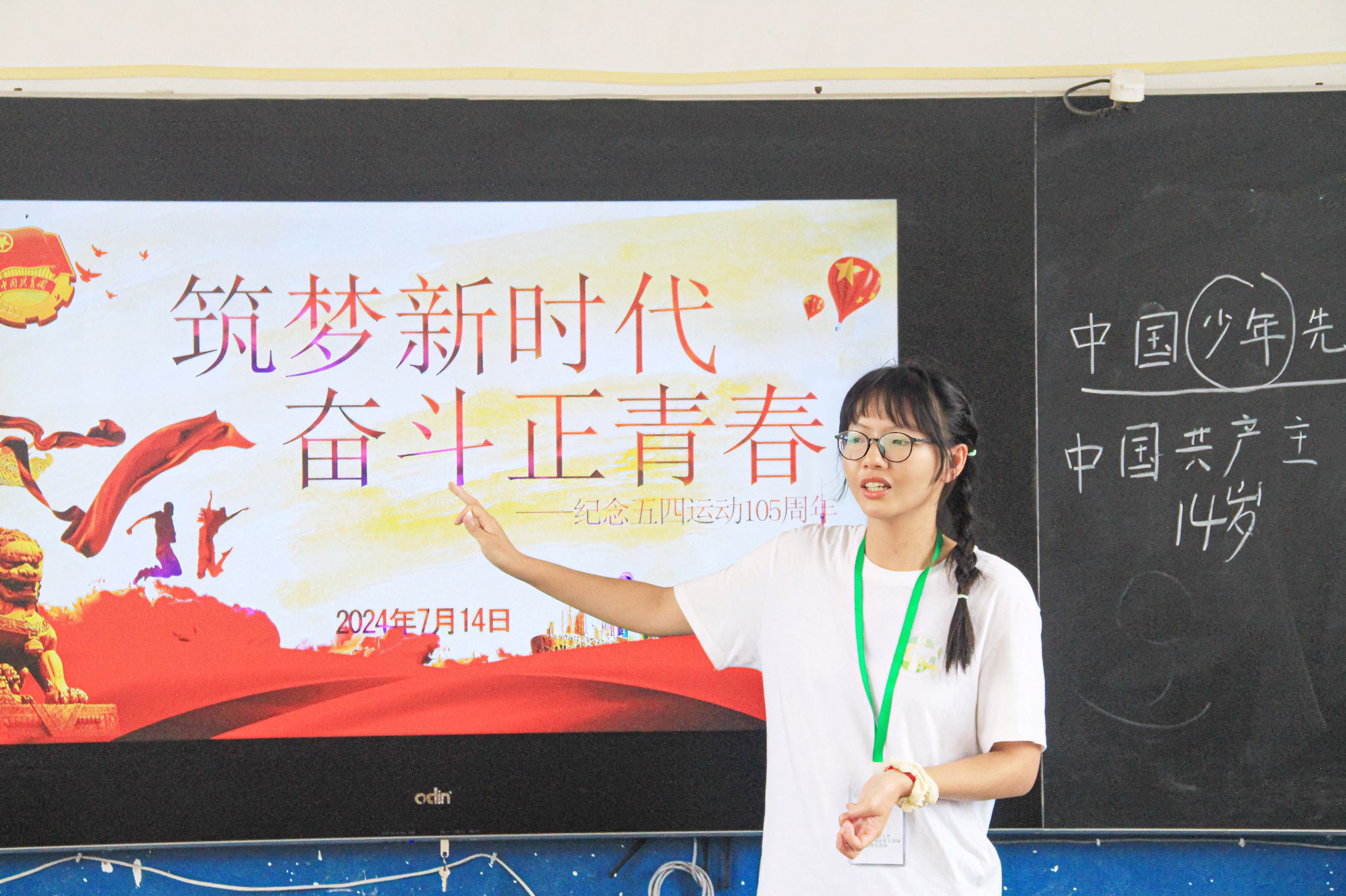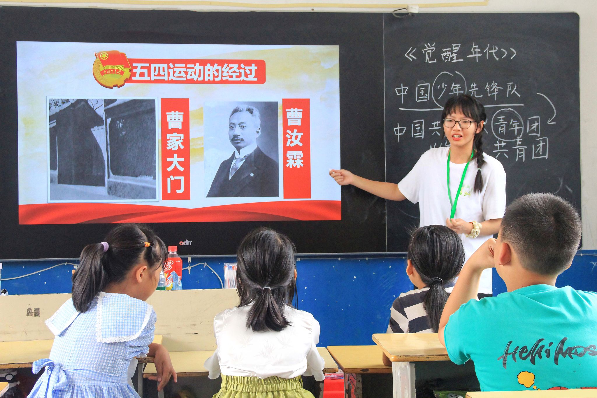 于红色论坛活动中,主讲人以五四运动的历史背景、起因、经过作为基本线索来讲述建党故事,传达五四精神中蕴含的爱国情怀。与此同时主讲人还根据不同学生在不同年龄阶段的理解能力来合理地设计讲座内容——分别以少先队员与共青团员的第一视角作为故事的切入点,带领学生观看五四主题视频、朗读“弘扬学习五四精神”的内容、进行五四知识问答等。