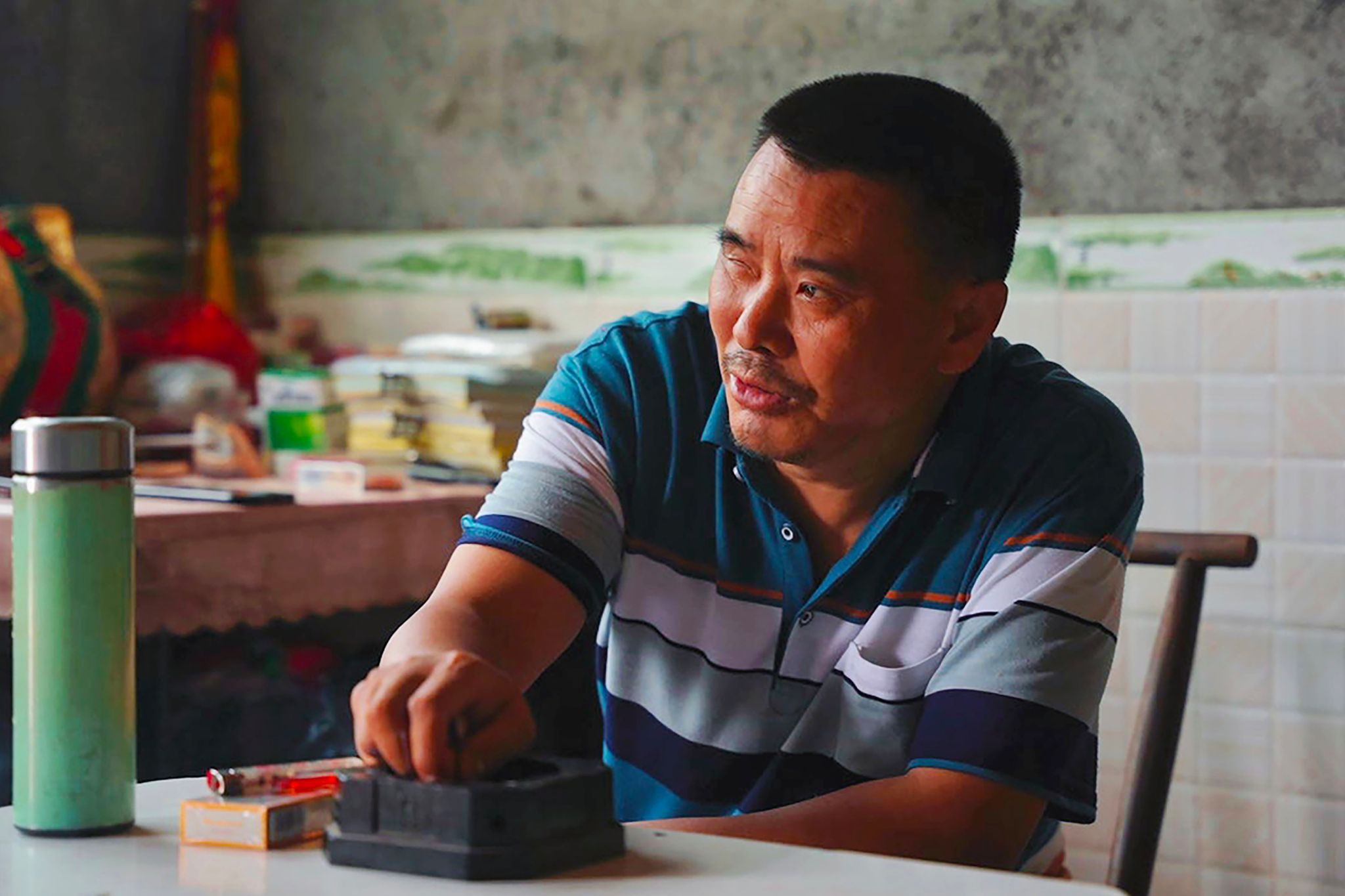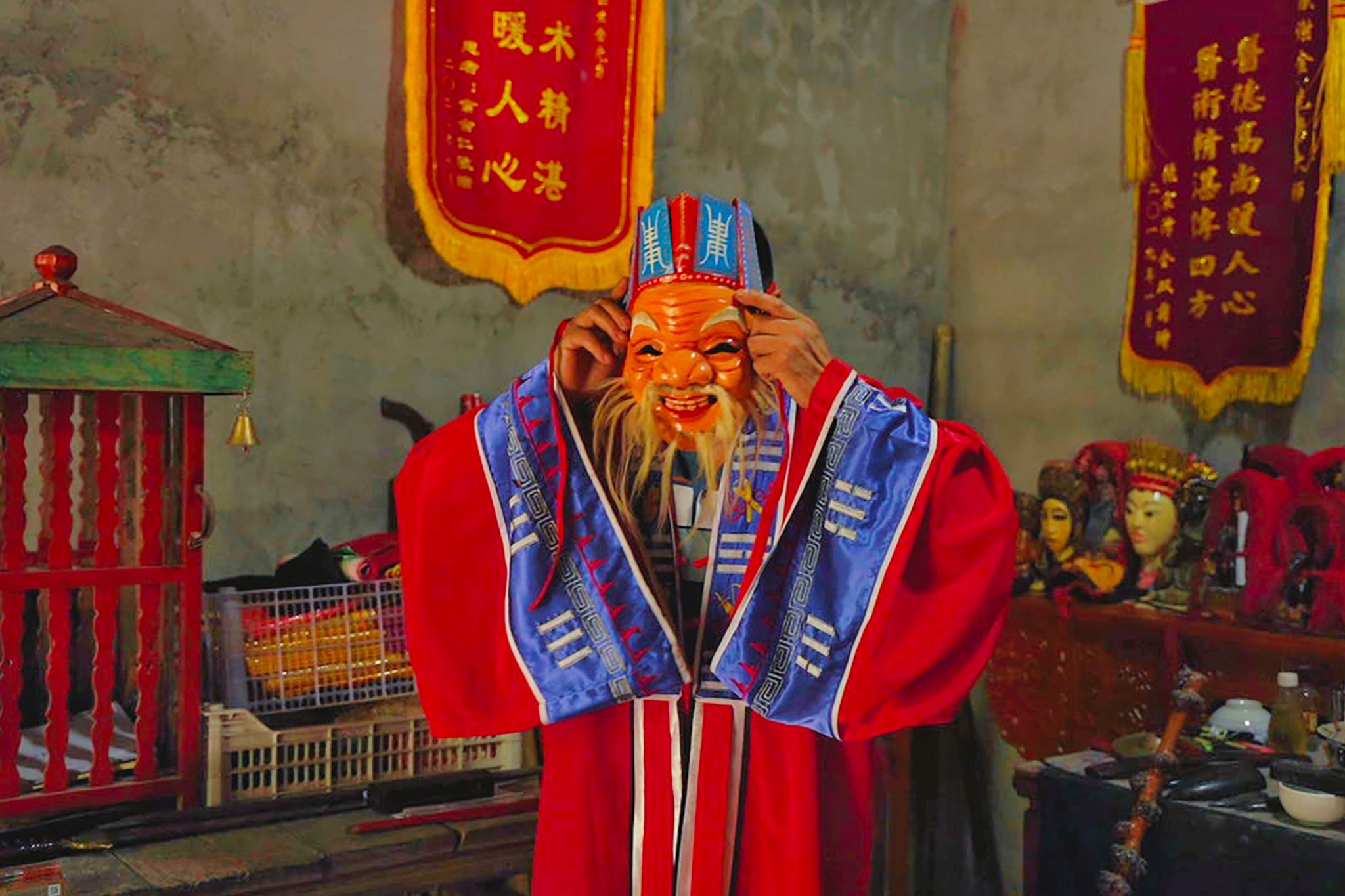 金先勇带领团队成员参观家中傩坛,向团队成员展示傩文、傩符、傩画,并讲解它们的用处。采访结束后,金先勇戴上傩面具,穿上傩戏服装,拿上法器,为团队成员表演了一段傩戏。