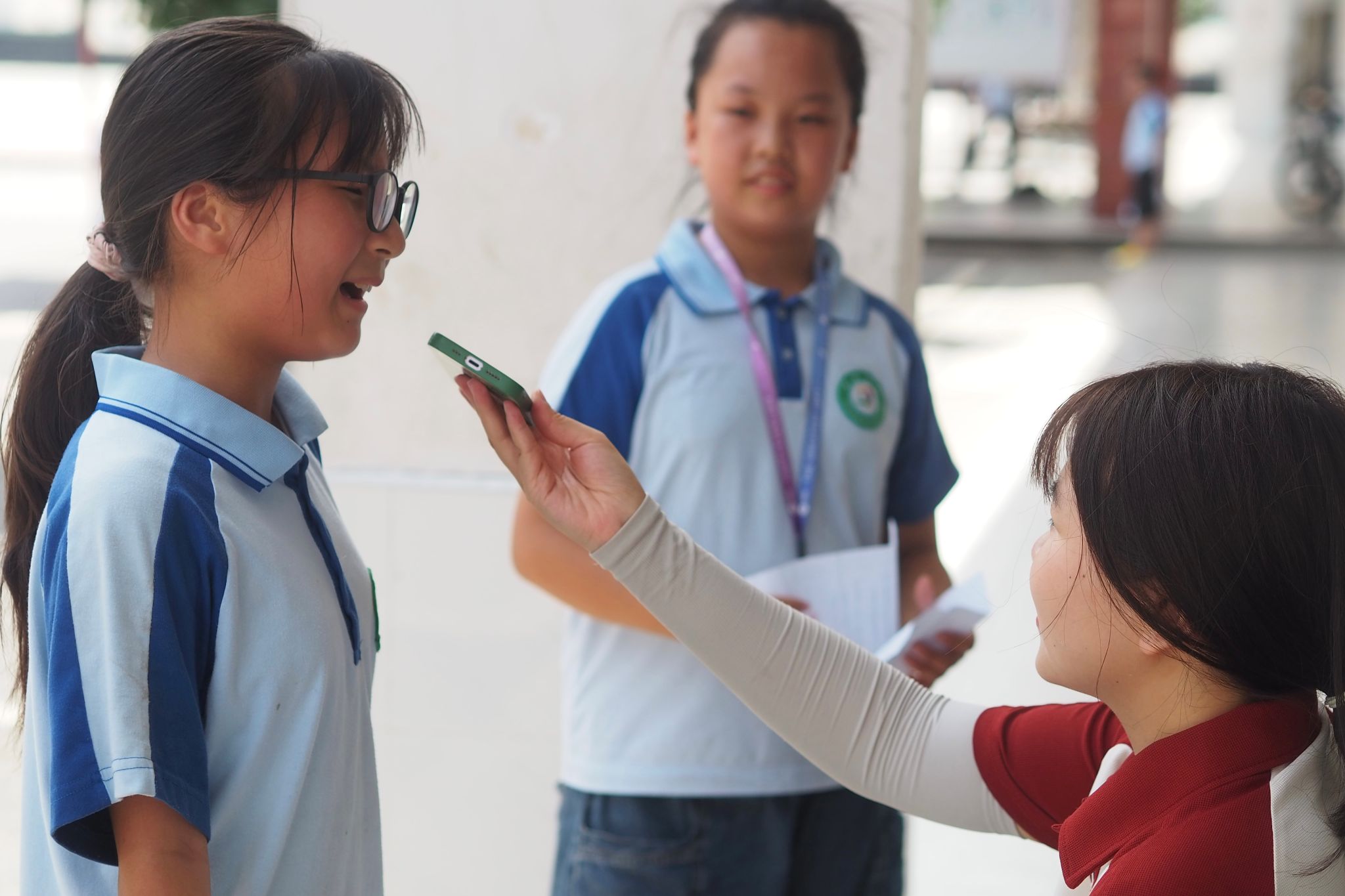 图为学生们大声喊出自己近期的一件幸福的事情,活动负责人在一旁测量分贝