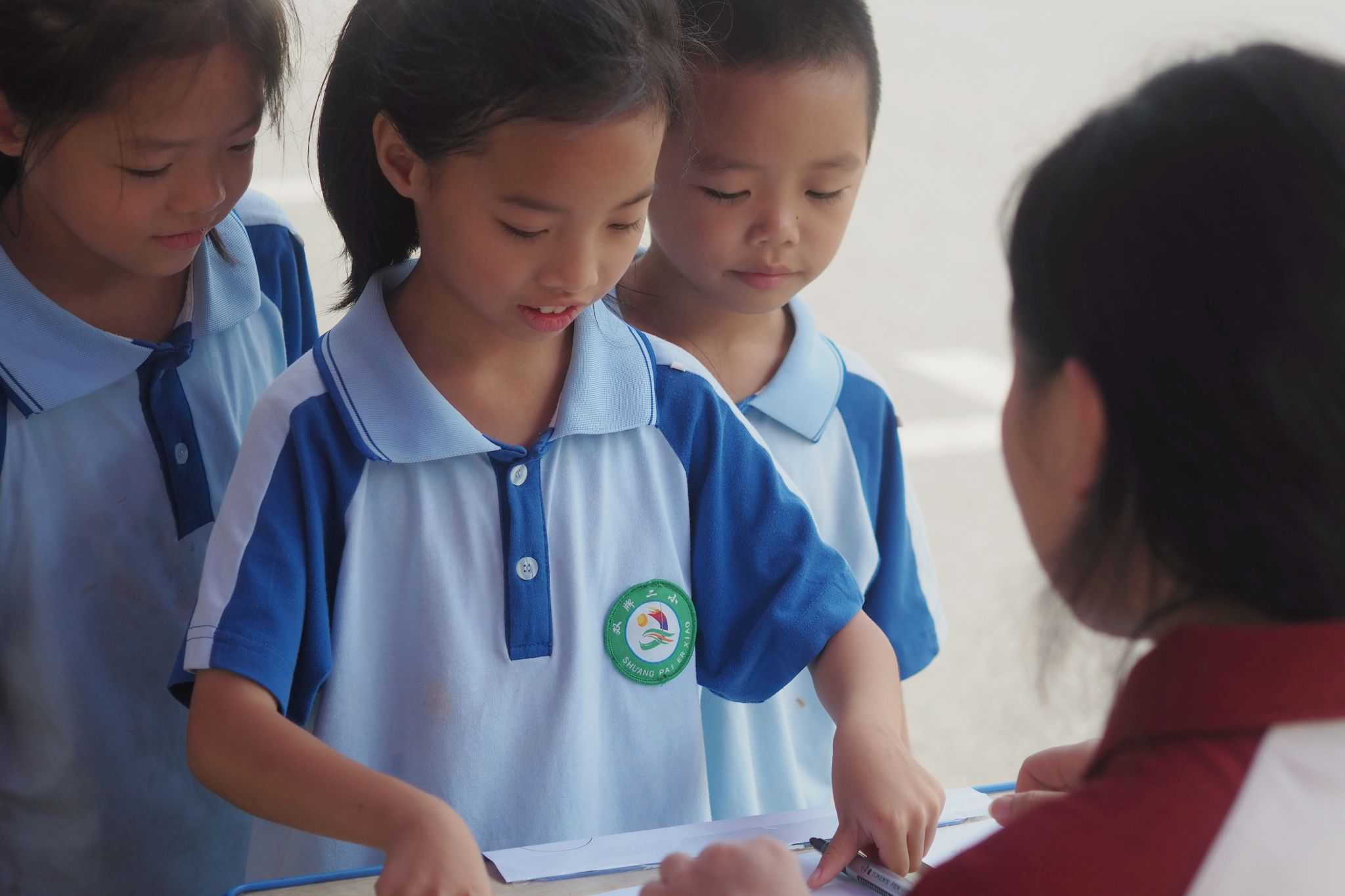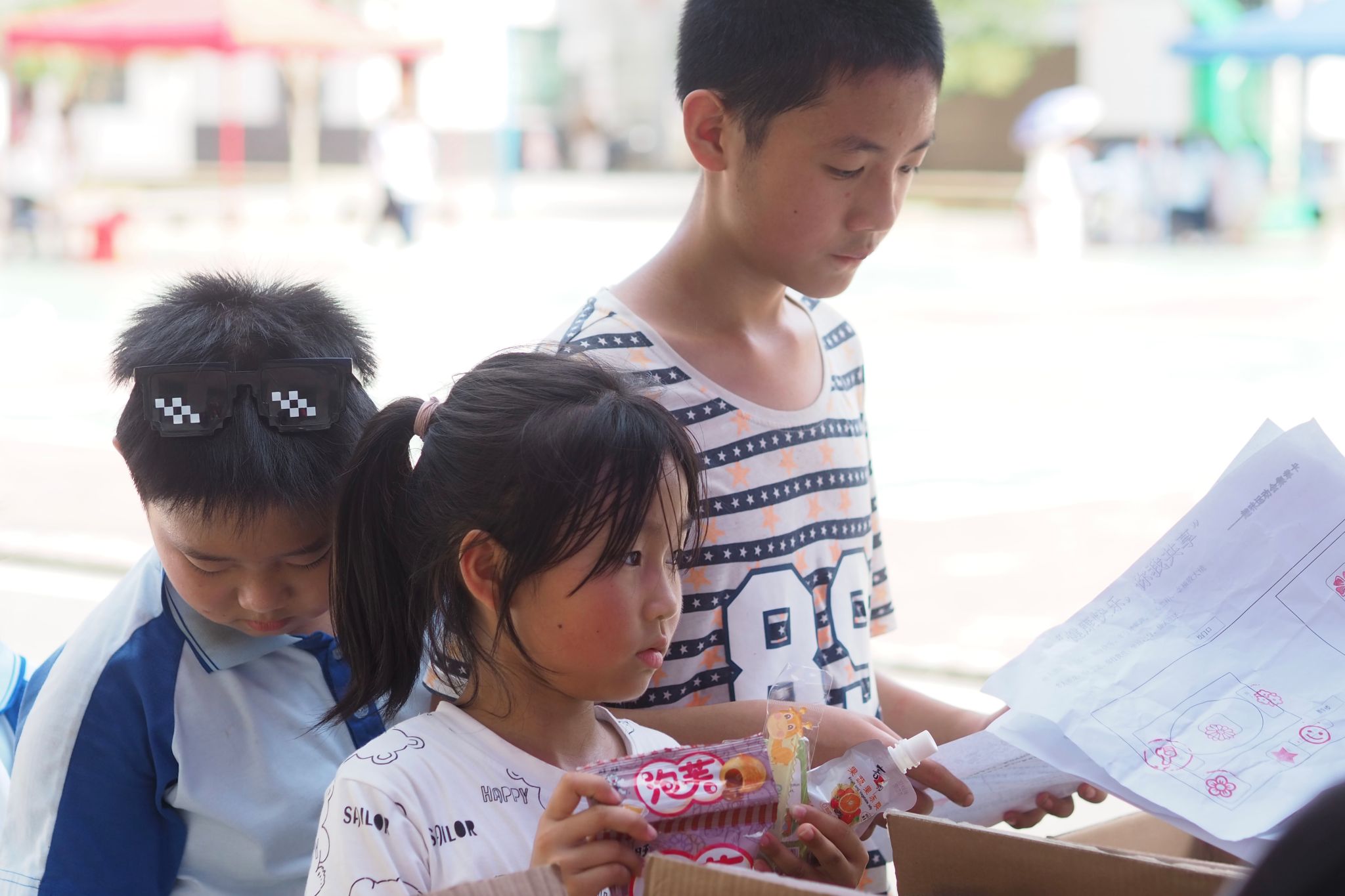 图为顺利完成游戏的同学们带着集章卡,来到奖品兑换处兑换文具和小零食