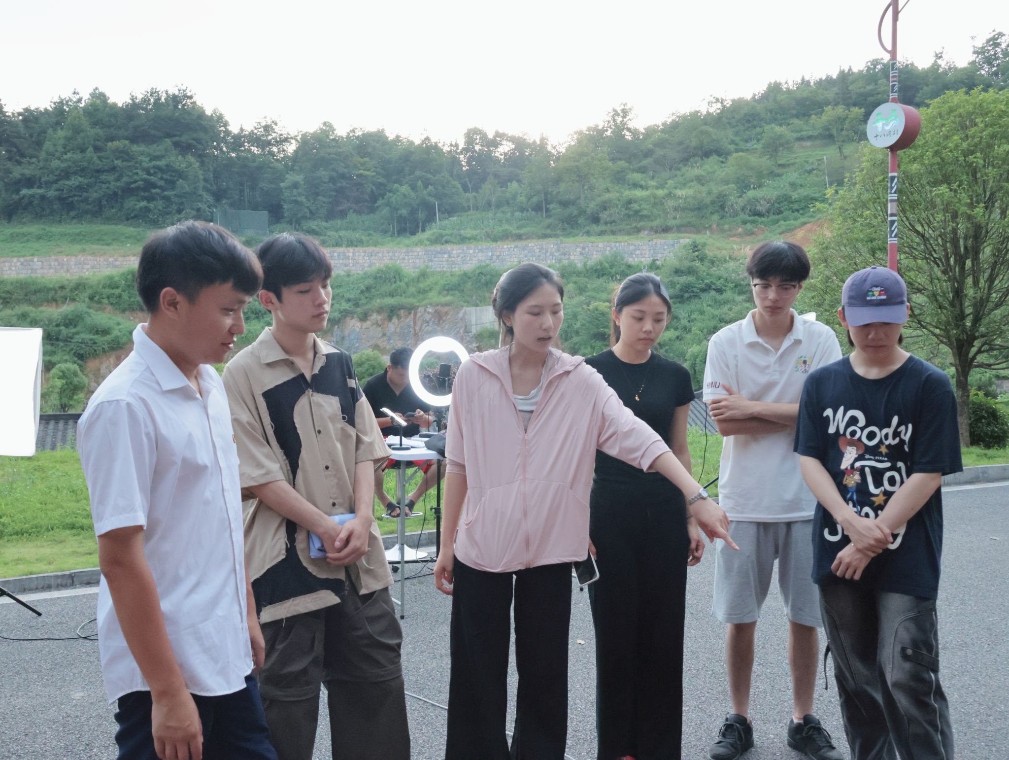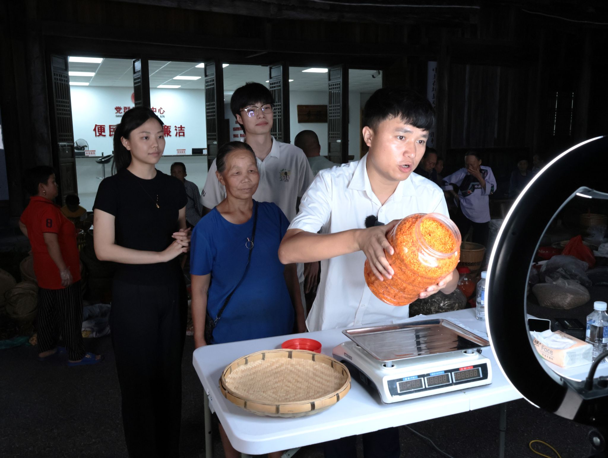 实践团成员正在配合施康书记进行特色助农直播活动