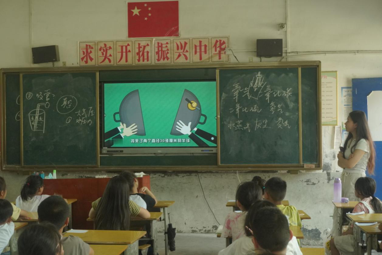 队员通过请学生回答空气的组成、吸管的工作原理、吸盘是如何沾在墙上以及注射器是如何使用的四个问题来带领学生感受大气压的存在和作用。为让学生进一步体会到生活中大气压的存在,她将事先准备好的水盆、矿泉水瓶、纸巾等实验工具拿出,并向学生示范如何进行实验。学生们在观察实验时发出惊叹,积极举手上台完成实验。实验过程中气氛融洽,学生参与度高,所有学生均参与了实验。进行第二个实验时,队员向学生提问如何将塑料杯中的空气排出,学生回答用火点燃杯中空气,她指出这个方法虽然不能够用来完成实验,但却可用于判断山洞中的氧气是否充足,既没有打击学生敢于思考、勇于发言的精神又向学生普及了科学知识。