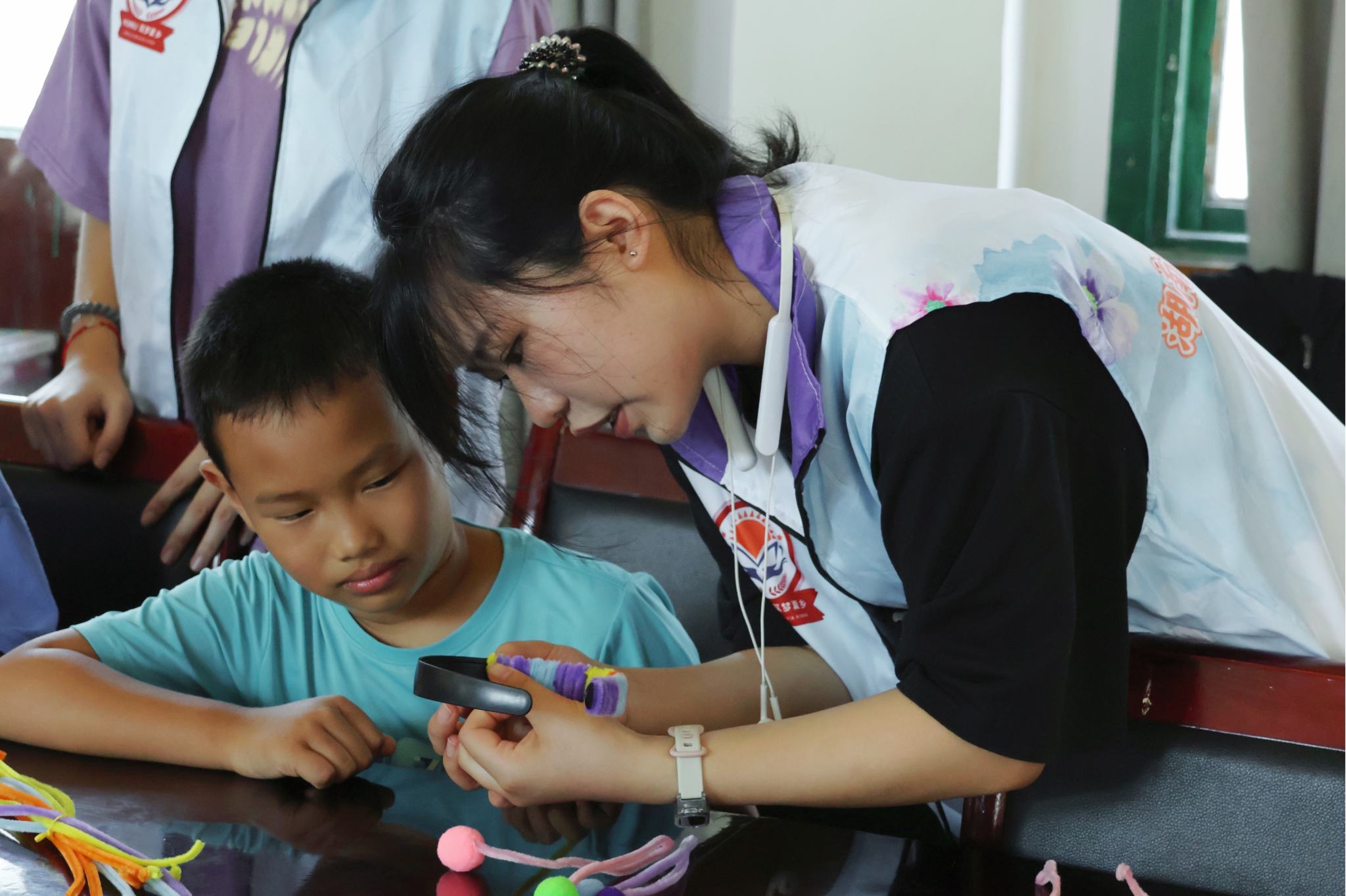 为增强孩子们对于张家界阳戏的体验感,吴欢借鉴张家界阳戏头饰的样式,使用扭扭棒、发箍等工具开展戏剧发箍制作的手工趣味课堂。考虑到发箍制作难度与工具使用的安全问题,服务队队员合理分工,为孩子们的人身安全与良好的课堂体验感保驾护航。制作过程中,孩子们并不拘泥于老师所展示出的发箍样式,而是发挥想象力,巧妙运用工具制作出了各式各样的发箍。课后,服务队队员与孩子们合影留念,为这堂手工趣味课画上句号。
