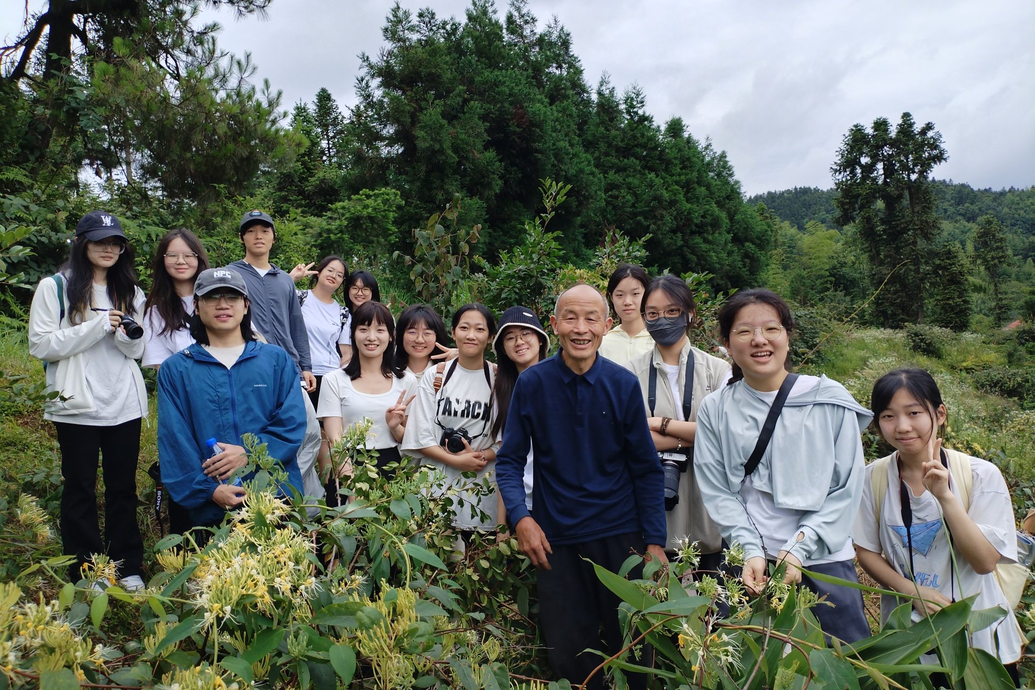 团队成员与花农共同采摘金银花