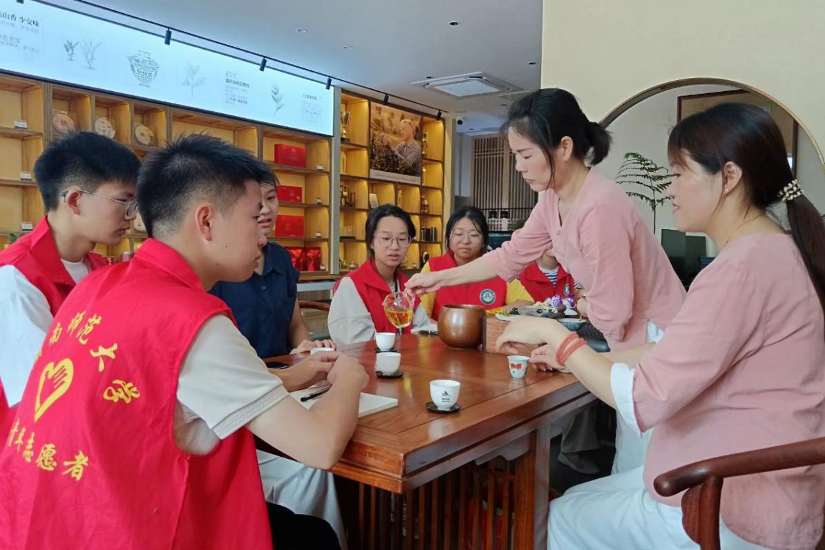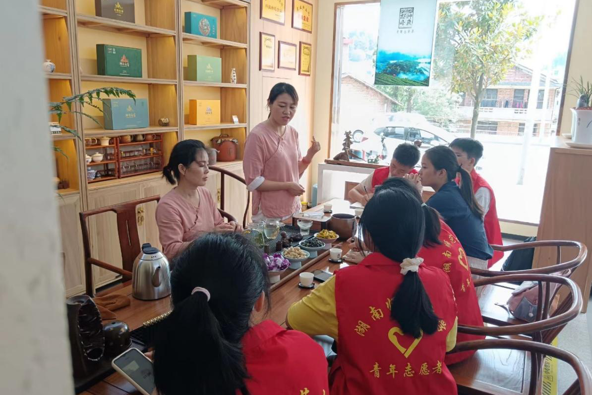 实践团成员前往炎陵当地白茶直营店,并采访店主。店主为成员们介绍店里销售茶叶类型及各种茶叶的特色,如白茶、野生红茶、老茶树茶、炎陵红茶等。她表示炎陵红茶作为当地特产,有“甘鲜味、花蜜香”之美誉,它曾代表株洲参加杭州国际茶叶博览会,并在第四届“国饮杯”评比中获一等奖。在谈及茶树的培养时,店主表示茶树的生长受到阳光、土壤、降水、温度等多重自然因素影响,对环境要求较高。其中,“神农白茶”每年只有十几天的采摘期,可采摘部分为一芽一叶,因此产量少、价格较高。随后,店内茶艺师为成员们简单介绍泡茶的步骤以及各个步骤的含义。成员们品尝部分当地特色茶水,并与工作人员合影留念。