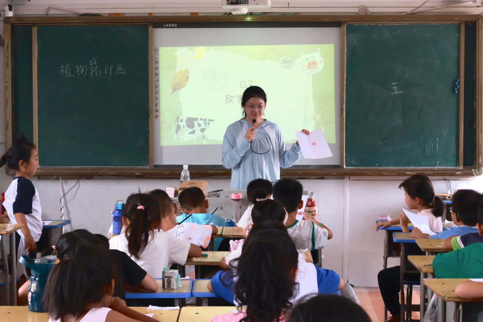 图为“绿影墨香,自然印迹”植物拓印课上,授课教师讲解如何制作植物拓印画。