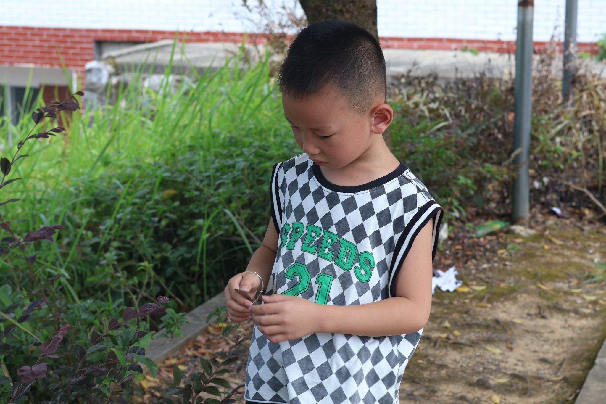 图为在夏日瓶子贴纸DIY课程中,学生捡拾校园树叶用于贴纸作品创造。
