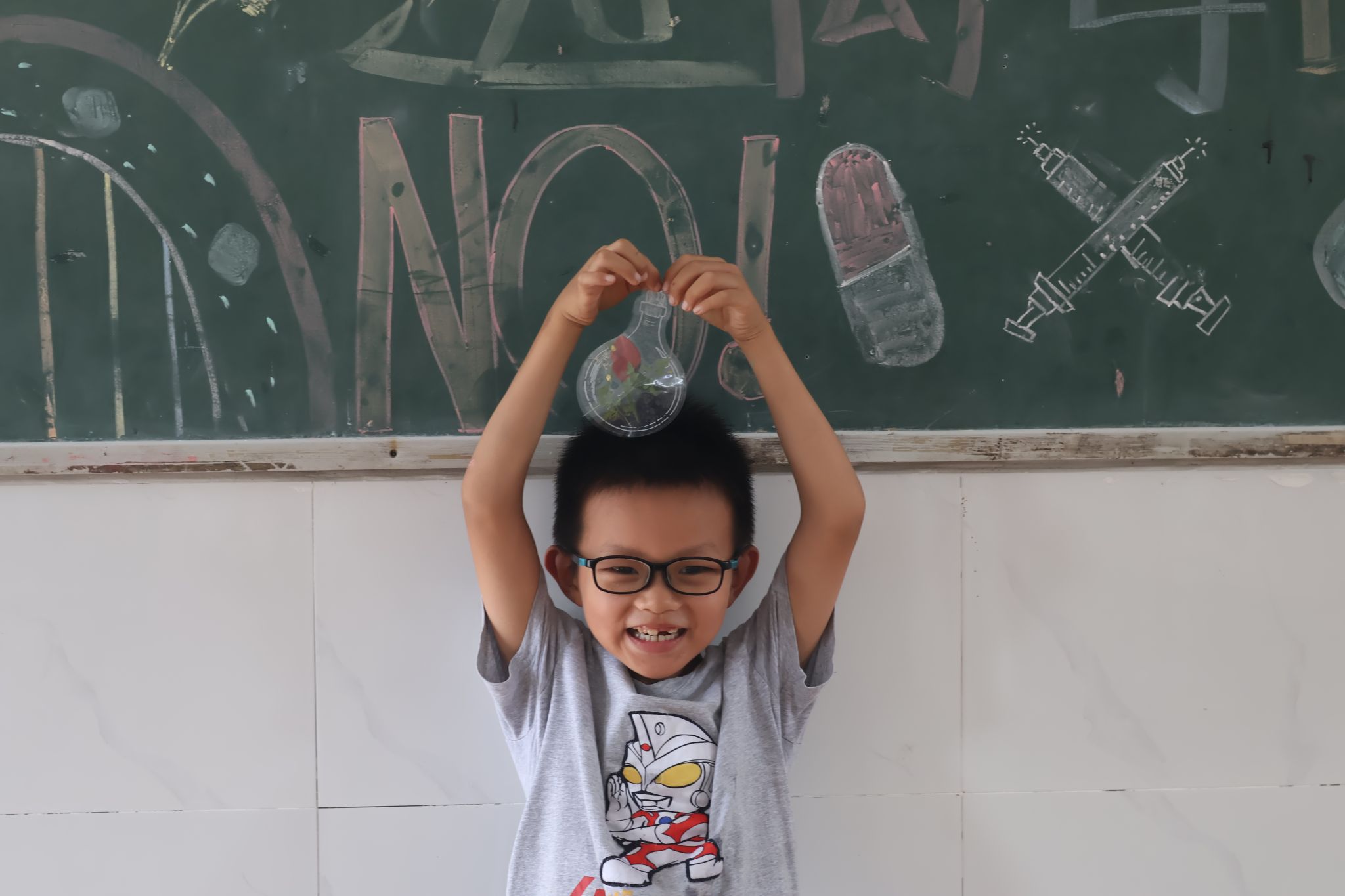 图为学生展示夏日瓶子贴纸DIY课程中创作的贴纸作品。