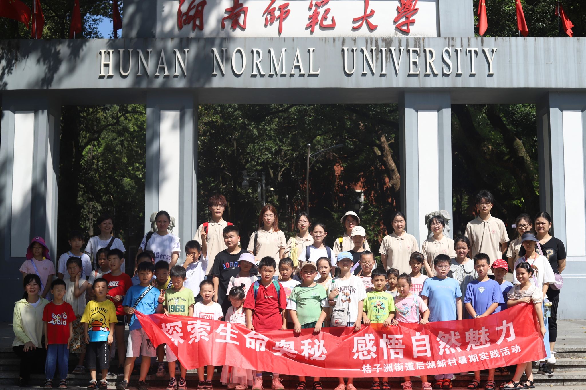 实践队成员与小朋友于太阳成集团tyc校门处合影