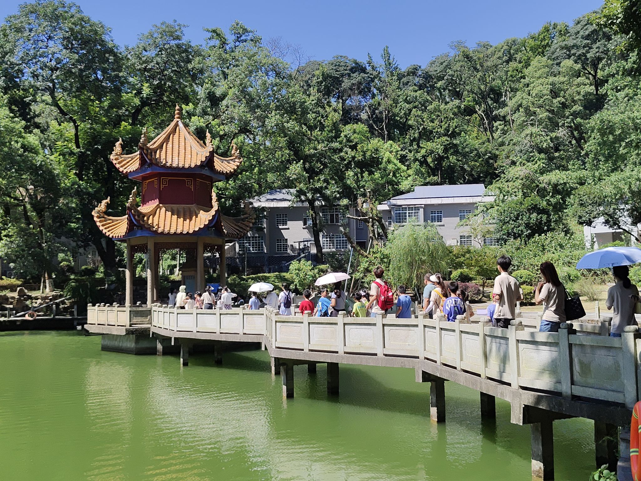 实践队成员于生科院集合清点活动所需物品,根据安排将学生们进行分组并组织签到。一组前往忠烈祠、岳王亭进行参观,并由范雄伟带领进行校园植物识别与采集。二组前往桃子湖湖畔认识与采集植物、清理福寿螺。采集完毕,学生们前往生科院汇合休息。