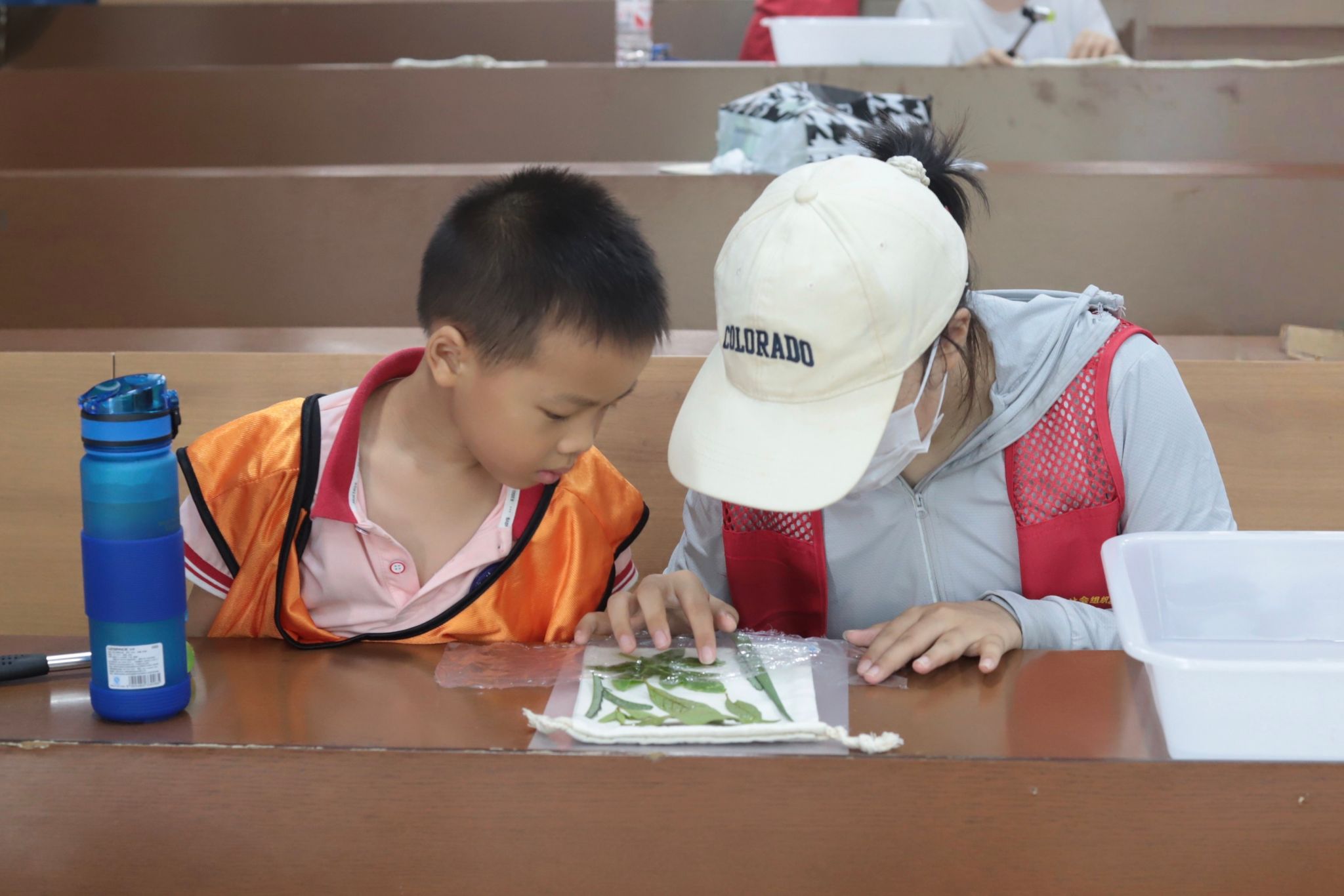 实践队成员帮助小朋友进行植物拓印