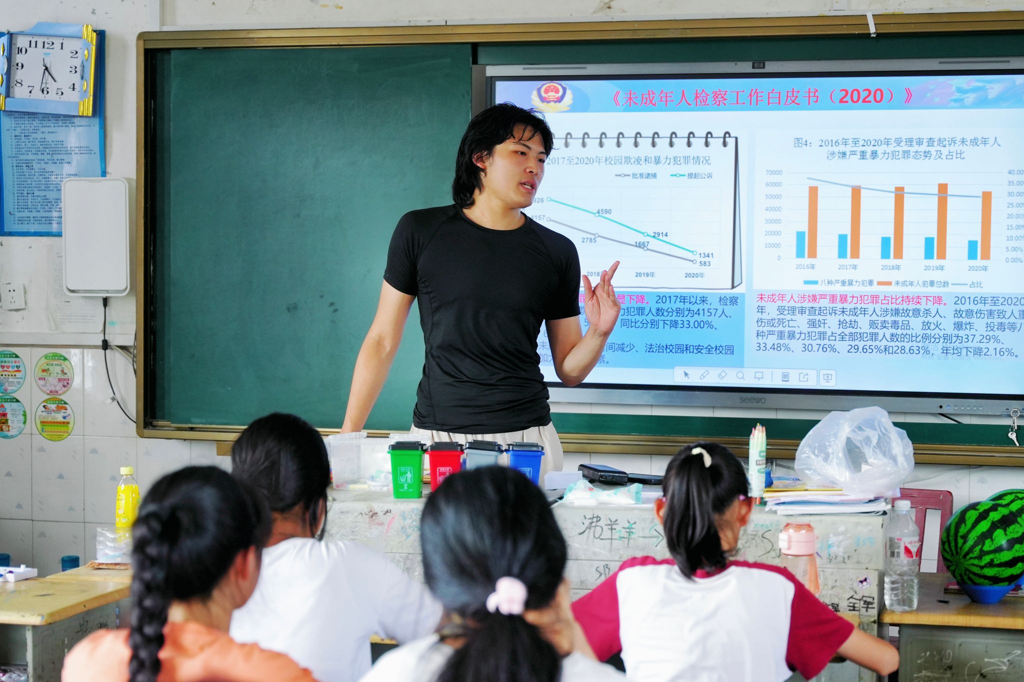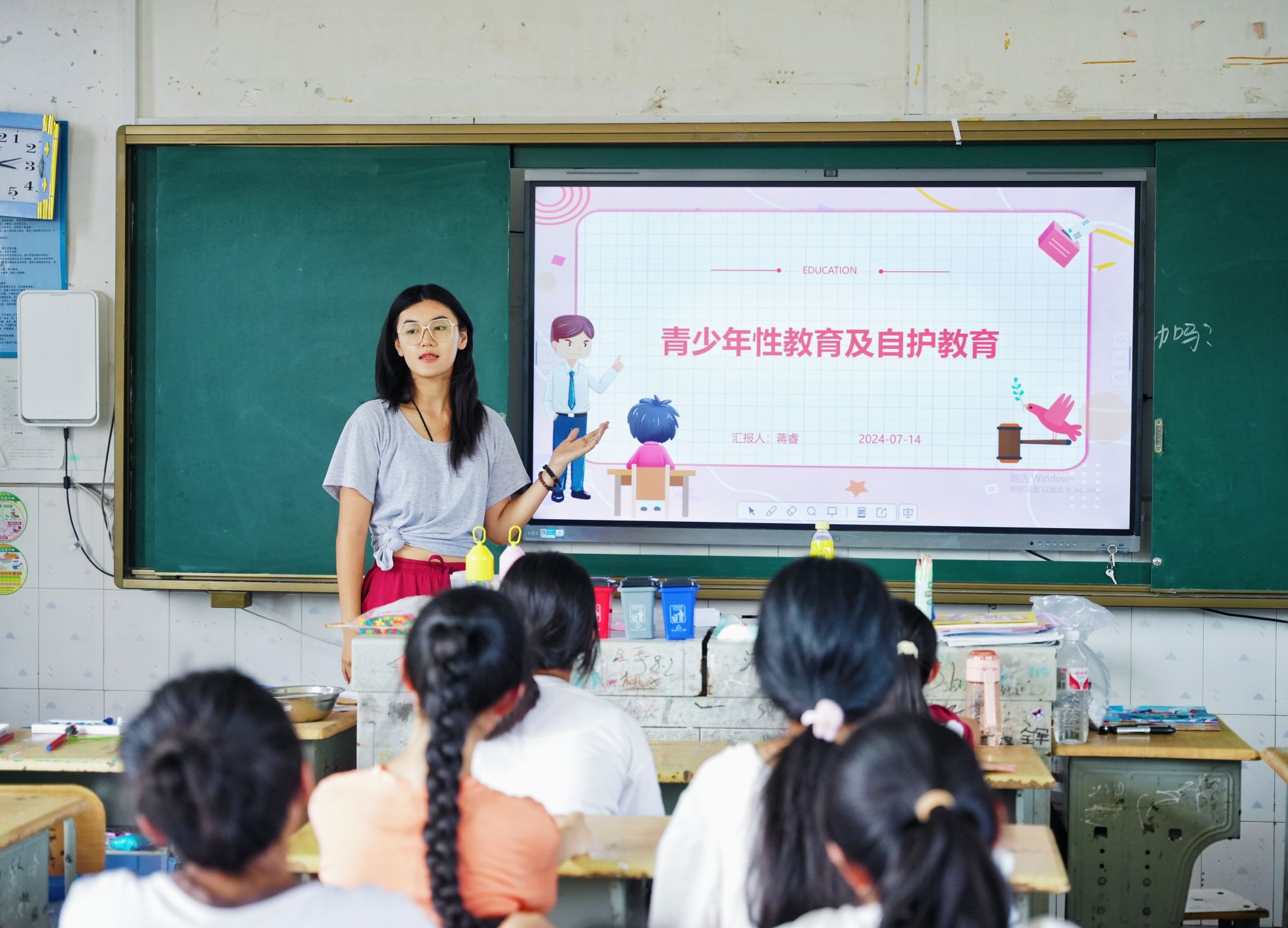 性教育课程分为三个板块:解释“性”的多方面内涵、认识生殖器官、树立防性侵意识。团队成员阐释“性”涵盖生物性、心理性与社会性多方面内容,引导学生树立正确的性观念,消除性羞耻。利用视频和板书的方式,团队成员说明了生殖器官的功能以及如何清洗、保护隐私部位,同时她引领学生了解生理期的注意事项,介绍了卫生巾、卫生棉条等卫生用品的用法。在防性侵板块,团队成员指出注意防范熟人性侵,并介绍性侵发生后如何利用法律武器捍卫个人权利。