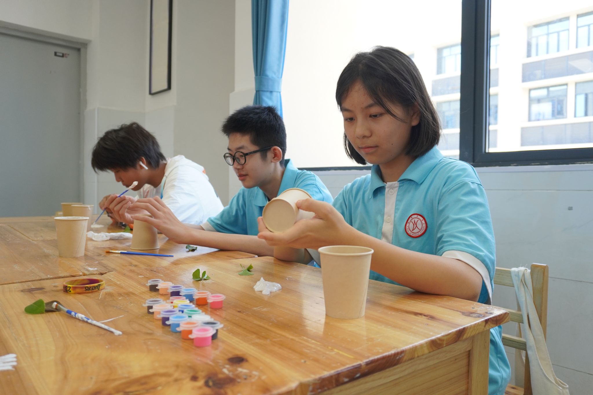 徐婧瑶详细介绍了叶脉化石的制作原理,并逐步示范其制作过程。同学们在她的指导下开始了叶脉化石的制作。他们先在室外挑选出自己喜欢的树叶,再用石膏拓印下叶片的痕迹,等待石膏硬化到一定程度后,为自己的拓印涂上喜欢的颜色。同学们在几次尝试后,制作出了一幅幅漂亮的“叶脉化石”。在制作完成后,同学们积极展示自己制作的“叶脉化石”并分享自己的想法与创意。