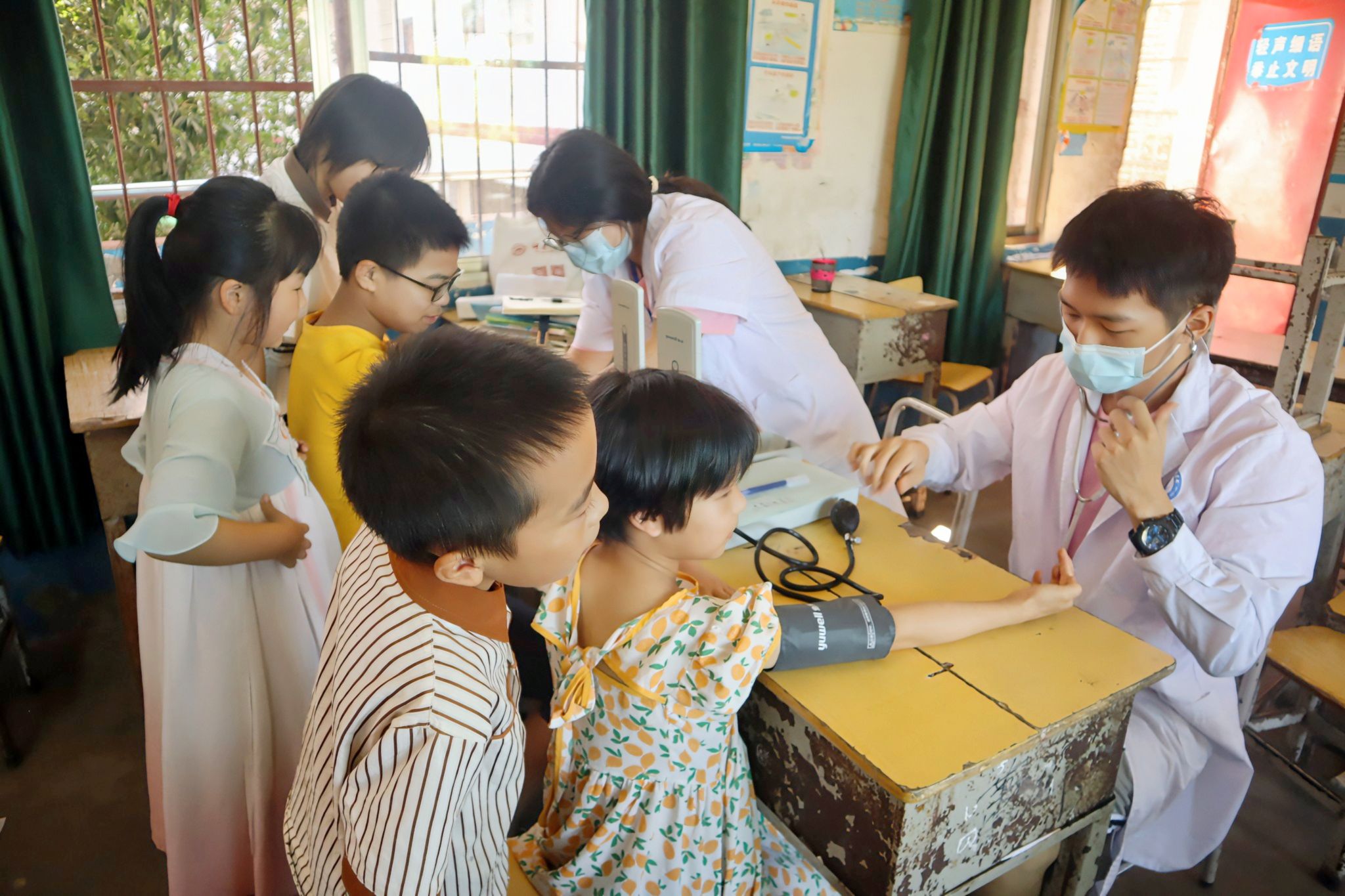 活动现场,实践团成员们分工明确,有序为学生量身高、测体重,检查视力,同时检测同学们的血糖、血压值,根据所测数据对孩子们进行科学的健康评估,提出具有针对性的饮食与运动建议。对于那些在体检中积极参与并高度配合的学生,实践团还特别设立了奖励机制,以此促进体检过程的顺利进行。