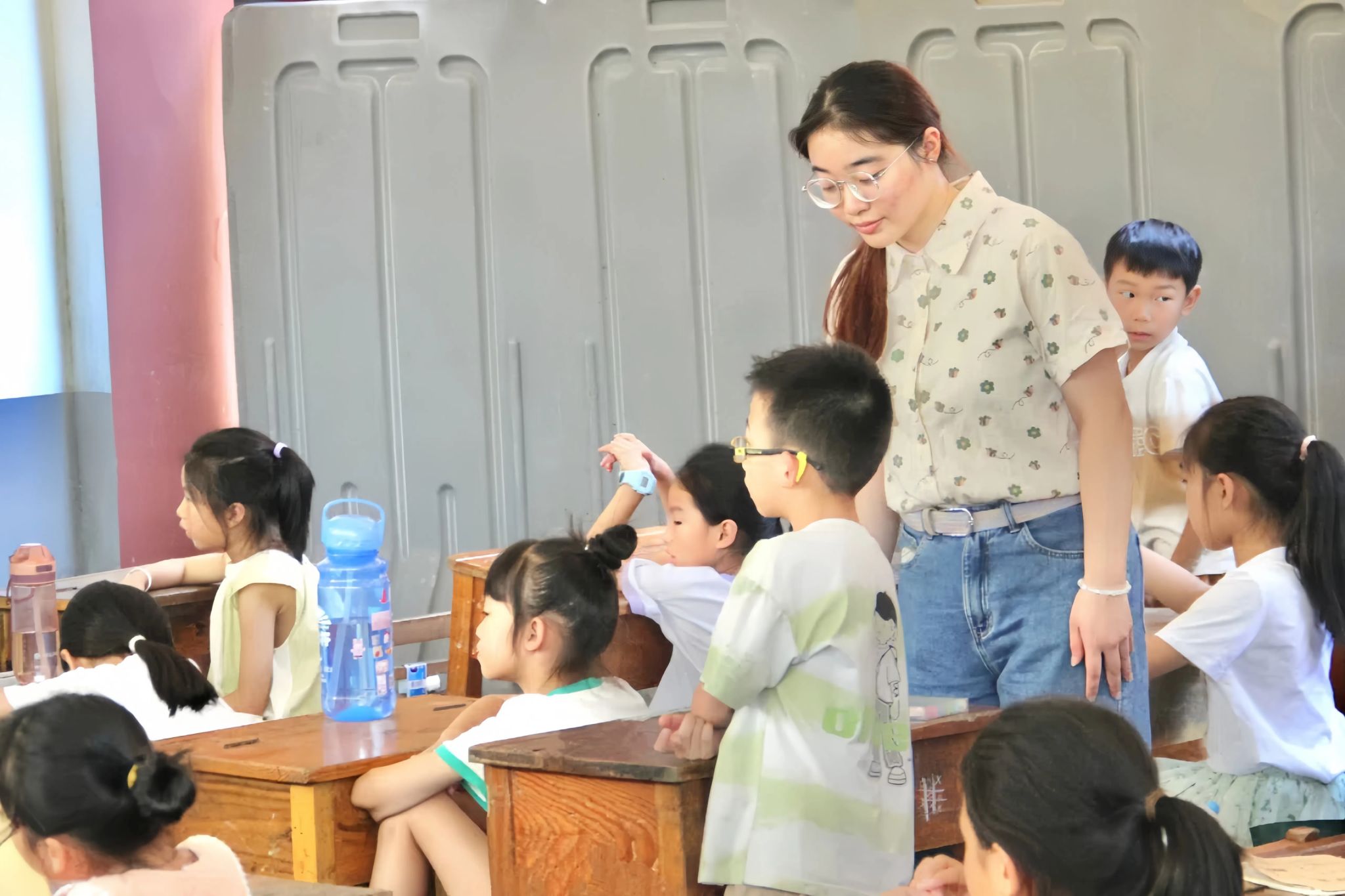 课程采用互动式的教学方式。实践团成员根据学生们的成长环境和年龄特点,结合自身对诗歌语言节奏的专业认知,对课程内容进行了精心设计。他们选择多首适合儿童的经典古诗和现代儿歌,如《静夜思》《咏鹅》和《面向大海,春暖花开》,通过故事讲解和情景表演的方式,帮助孩子们理解诗歌的内容和情感,掌握诗歌的朗诵技巧。