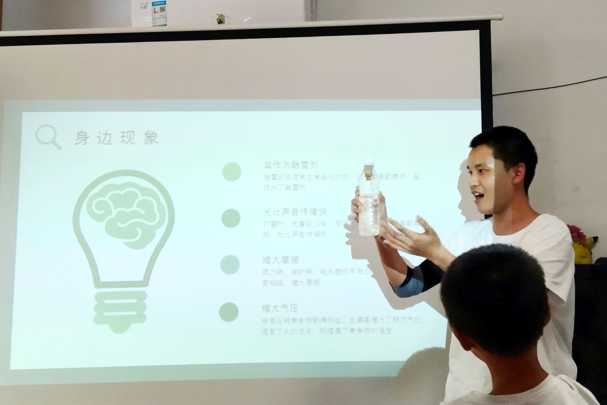 在物理课上,团队成员以生活中常见的物理现象为例,为孩子们揭示了物理学科的奥秘。为了使孩子们更好地理解物理原理,主讲人还现场进行了压强实验。利用水瓶和小玻璃瓶等简单的实验器材,主讲人生动地展示了水压的作用,让孩子们在亲自动手中领略物理学科的趣味。