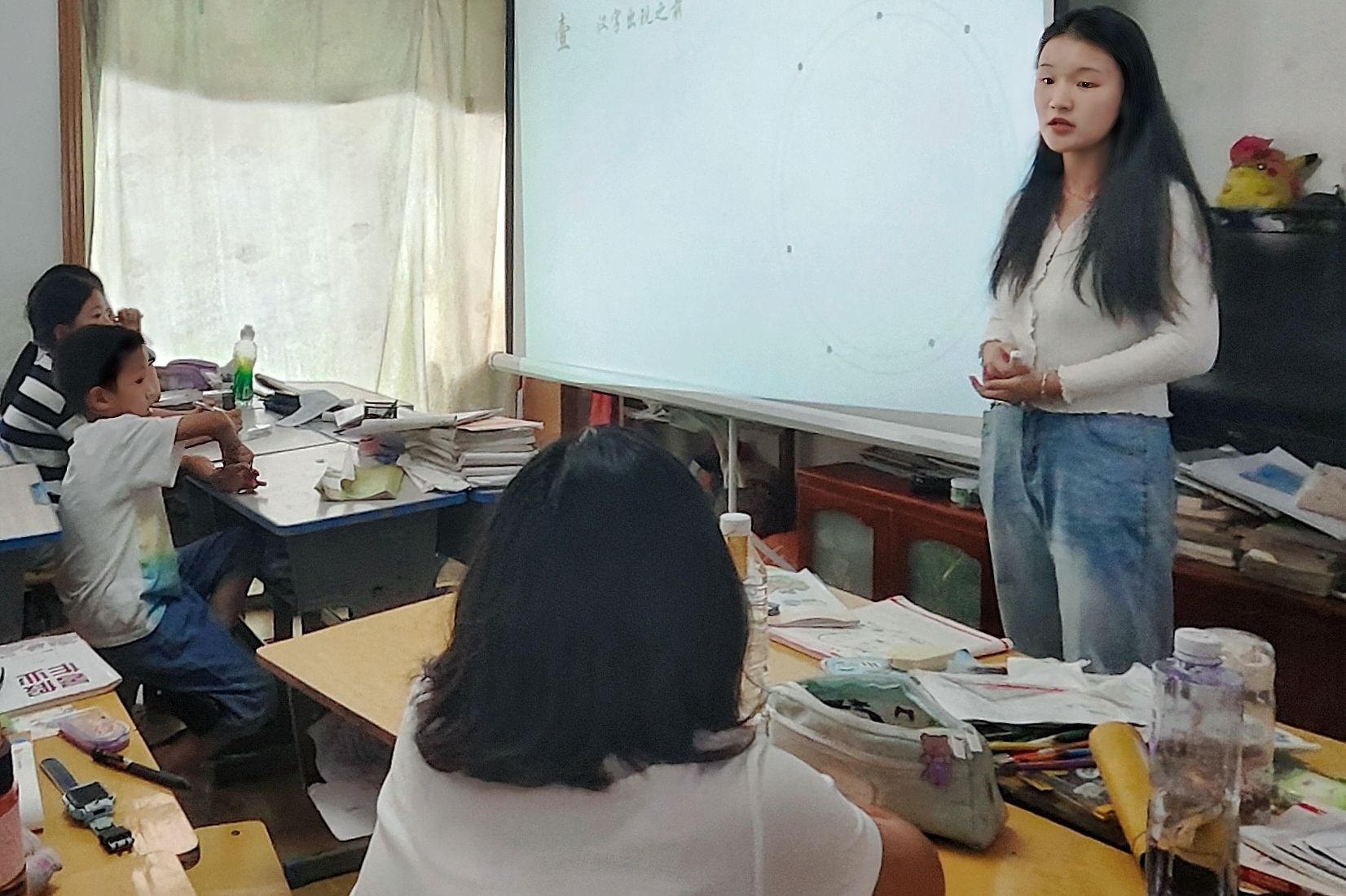 活动现场,实践团成员为孩子们带来了语文和物理两门课程。在语文课上,团队成员详细讲解了汉字的起源与演变过程,让孩子们对中华传统文化的有了更深刻的认识。主讲人也通过问答方式,让孩子们根据甲骨文的模样猜测其代表的意思,让他们在欢乐中感受到汉字的魅力。
