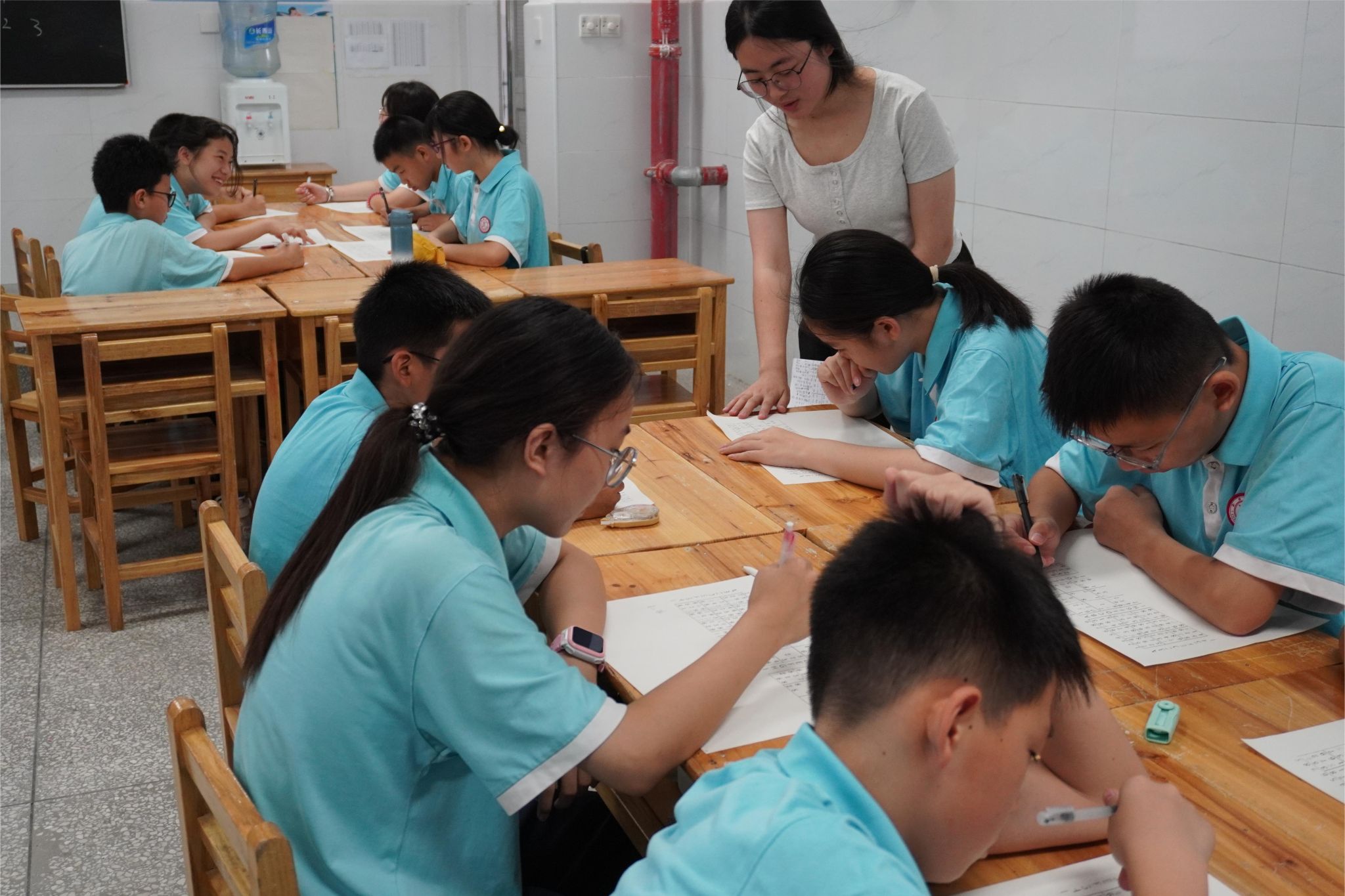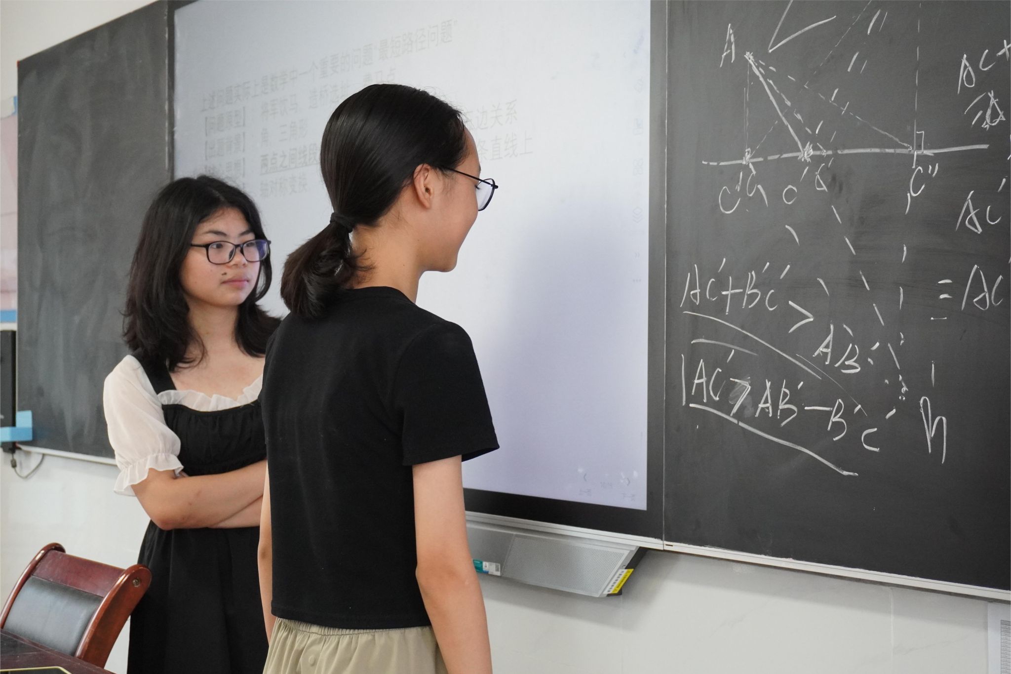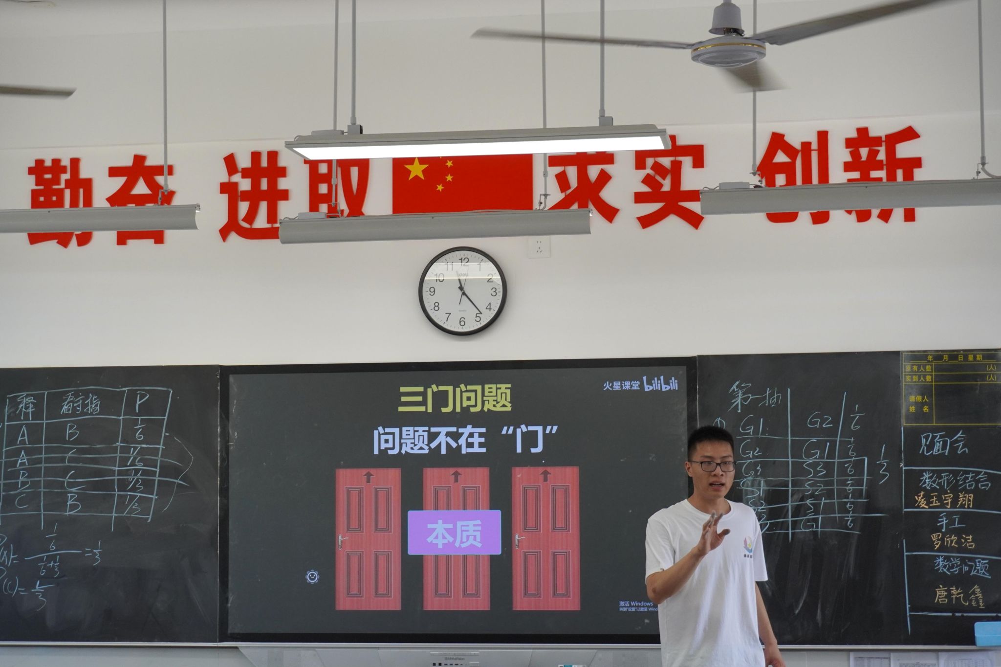 (通讯员 胡铮 舒敏 刘芮莹)7月20日上午,数学与统计学院(以下简称数统院)“师翼启梦”暑期社会实践团(以下简称“实践团”)于岳西中学开设“寓数于乐”系列课程。实践团成员围绕“最短路径问题”“三门问题”以及“数独问题”进行讲解。课堂上学生积极举手,踊跃发言,认真完成小组作业。