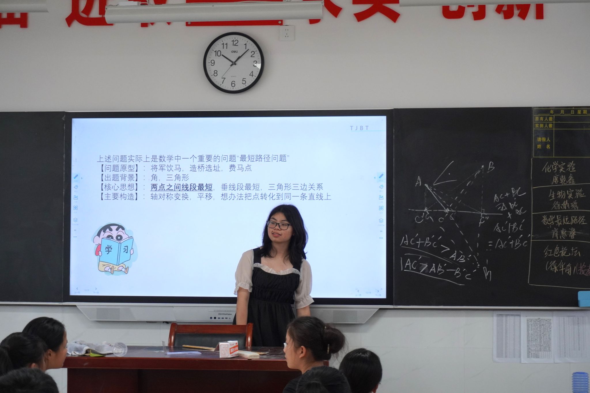 图为实践团成员指导学生分析例题“将军饮马”,帮助其找出最佳辅助点。
