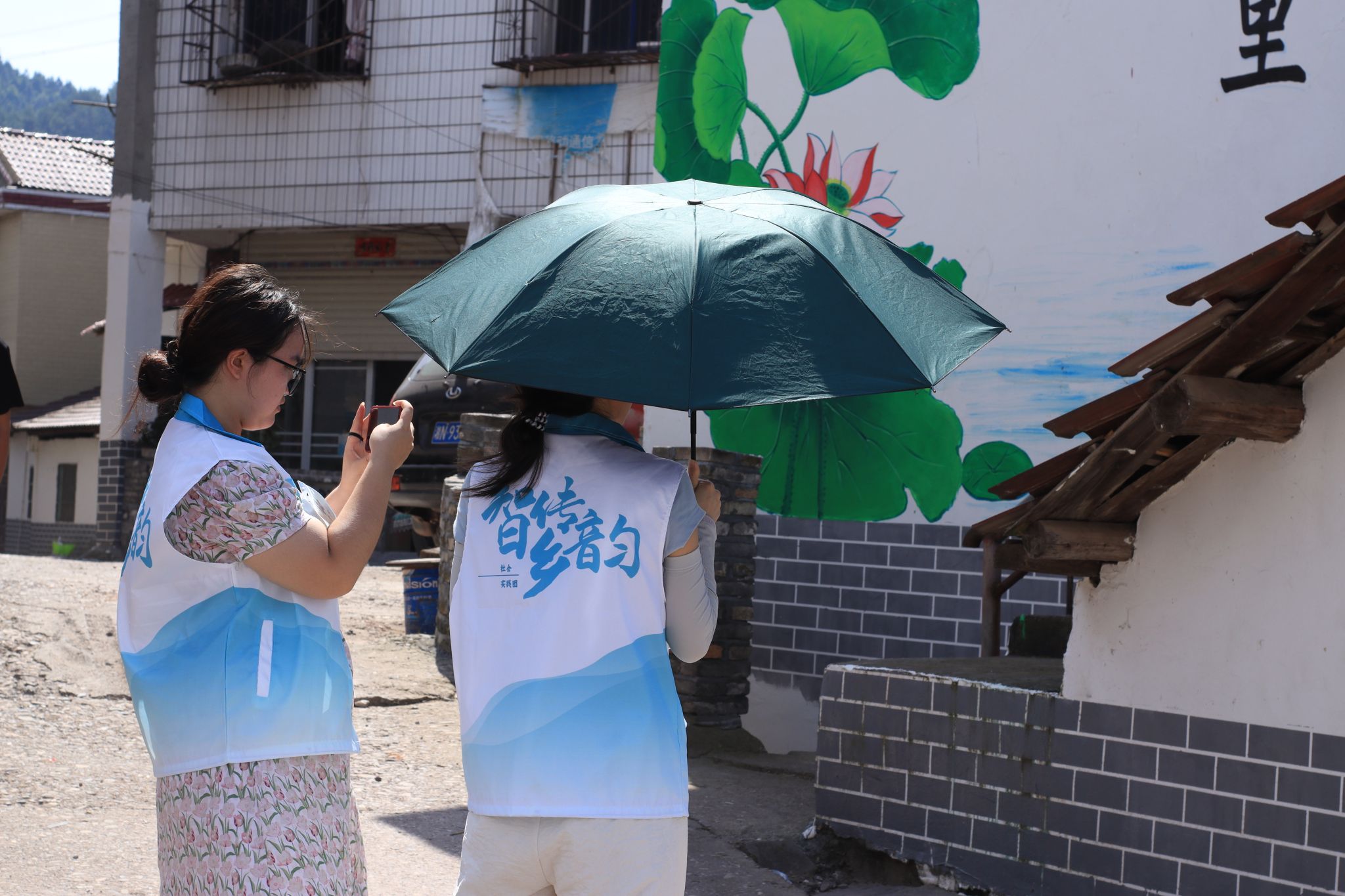 在填色阶段,实践团成员们迎着烈日,将设计内容绘制在岩板铺村的墙壁上。通过团队的共同努力与细致分工,黑白线稿一步步被赋予色彩与纹理,一幅幅充满生机与活力的墙绘逐步完成。