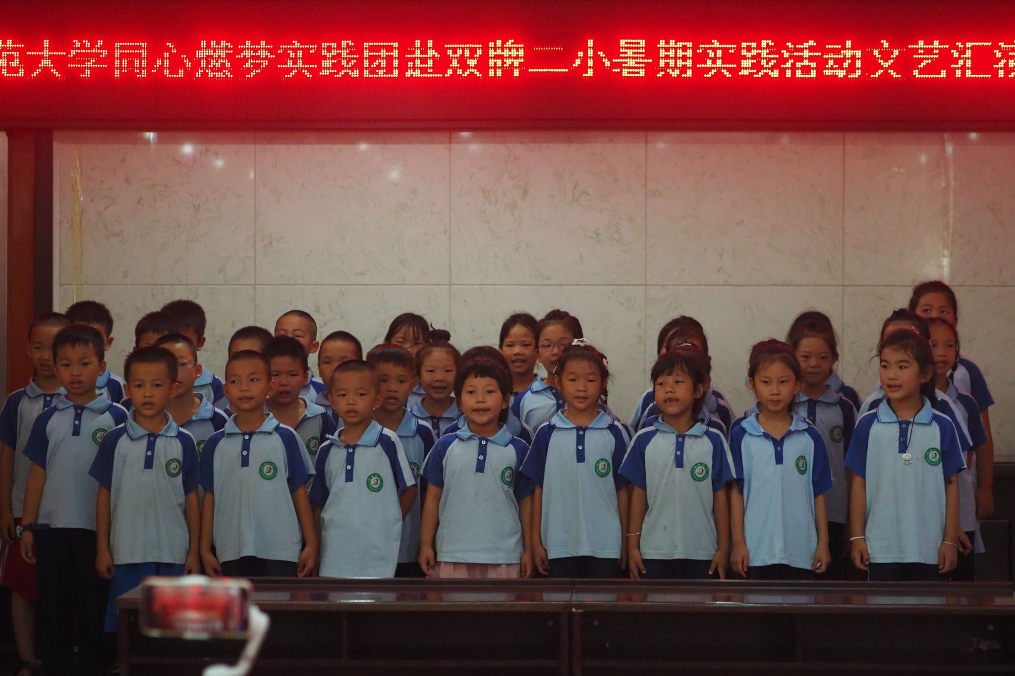 此次文艺汇演以舞蹈节目《向快乐出发》拉开帷幕,调动了全场氛围,太极拳展现了同学们的蓬勃朝气,手语操《和你一样》传递了浓厚的师生之情,三个班级的学生依次进行合唱与朗诵节目表演,展现了小学生的青春活力。文艺汇演最后,实践团成员集体合唱《当我们一起走过》,大屏上播放着十多天来实践团成员与学生相处的点滴,呼应告别的主题。